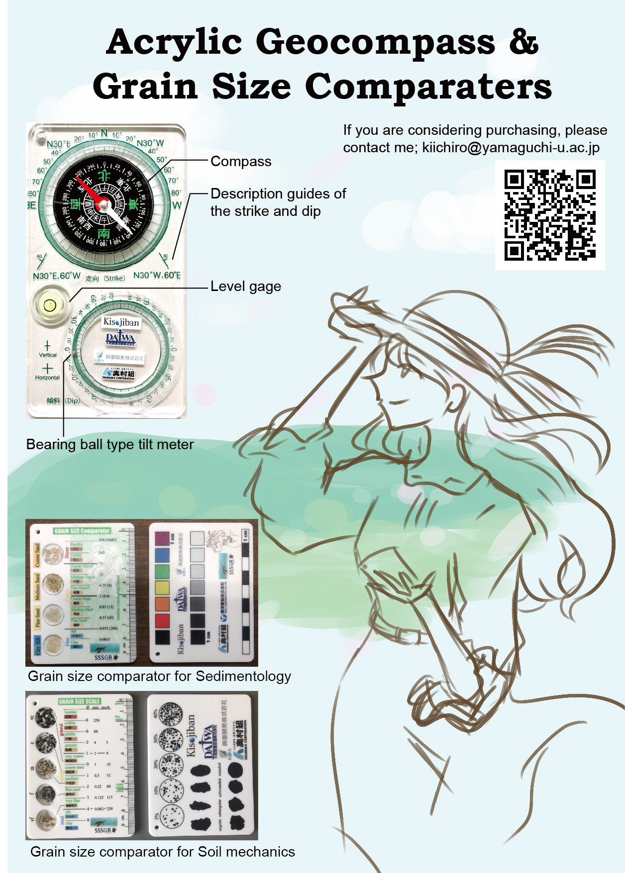 Acryl geocompass, Grain size comparator for sedimentology, for soil mechanics