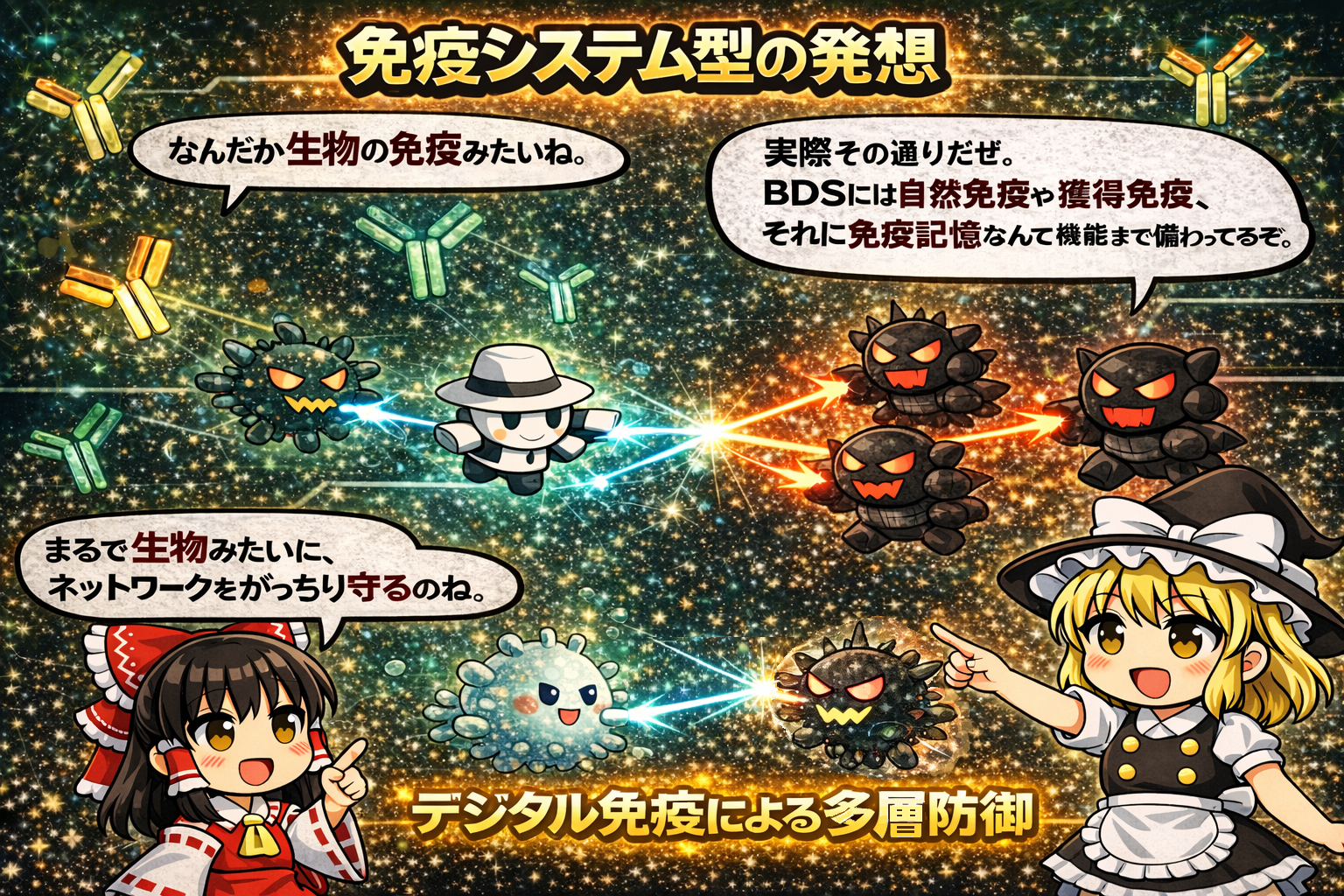 Marisa: Yeah. It's equipped with innate immunity, aquired immunity, and even immune memory. It guards the network tight, just like a living organism. Professor Yamaguchi calls this "Digital Immunity."