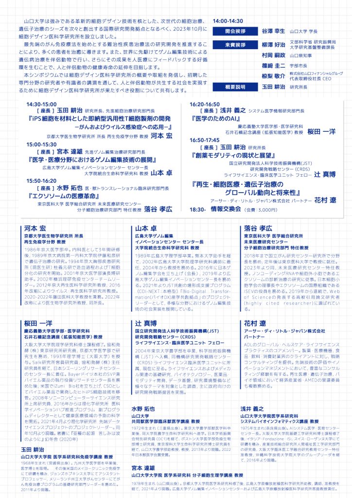 山口大学細胞デザイン医科学研究所は、山口大学が強みとする革新的細胞デザイン技術を核とした、次世代の細胞治療、遺伝子治療のシーズを次々と創出する国際研究開発拠点を目指し、山口大学としては23年ぶりとなる附置研究所として、令和5年10月に設立されました。本シンポジウムは、設立を記念するキックオフイベントとして行いました。