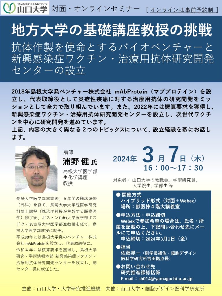 2024年3月7日(木)に山口大学吉田キャンパス 獣医棟4階大講義室で「地方大学の基礎講座教授の挑戦」を開催しました。 島根大学医学部生化学講座 浦野 健 教授を講師としてお招きし、治療用抗体の作製を使命とするバイオベンチャー株式会社mAbProteinと島根大学新興感染症ワクチン・治療用抗体研究開発センターの設立という、内容の大きく異なる2つのトピックスについて、設立経験を基にご講演いただきました。