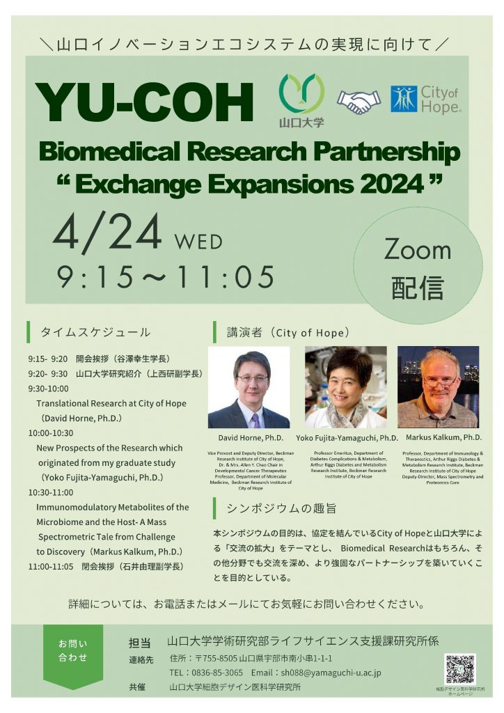 2024年4月24日(水)にオンライン配信(Zoom)で「国際シンポジウム(YU-COH Biomedical Research Partnership “ Exchange Expansions 2024 ”)」を開催しました。