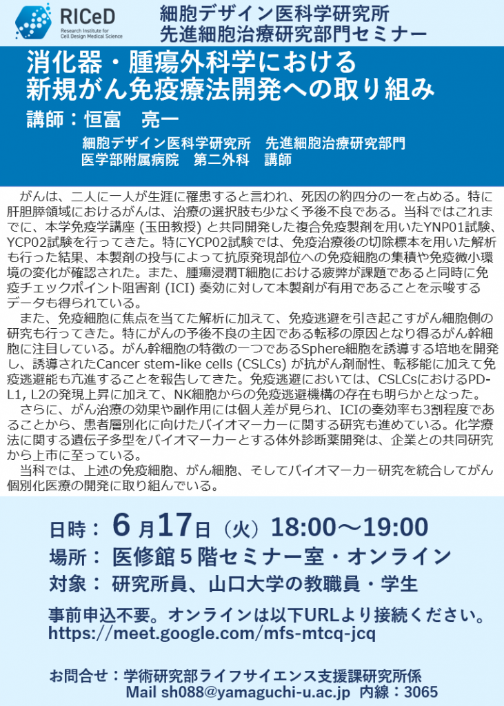 *ご案内* 6/17(火)所内セミナー「消化器・腫瘍外科学における新規がん免疫療法開発への取り組み」を開催します