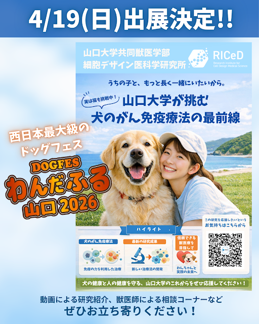 2026年4月18日(土)19(日)に、ドッグフェス わんだふる 山口2026 が 山口きらら博記念公園大芝生広場で開催されます。細胞デザイン医科学研究所も、19日(日)に出展します。お時間のある方は是非お立ち寄りください。