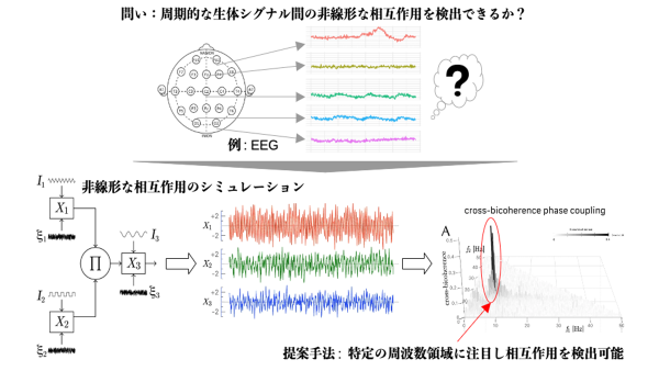 山口大学大学院医学系研究科(医学専攻) 医学系研究科・医学部附属病院AIシステム医学・医療研究教育センターの安部武志助教、大学院医学系研究科(医学専攻)システムバイオインフォマティクス講座の浅井義之教授らの研究グループは、スイスのローザンヌ大学との共同研究により、周期的な生体信号を模した統計過程モデルを用いて、時系列間の非線形な相互作用を高次スペクトル解析手法で効率的に検出できることを明らかにしました。
