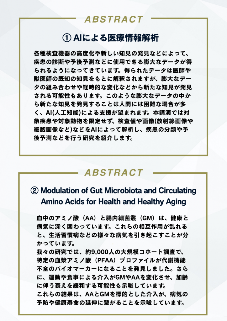 2025年10月23日(木)に小串キャンパス 医修館5階 セミナー室で「① AIによる医療情報解析」「②Modulation of Gut Microbiota and Circulating Amino Acids for Health and Healthy Aging」というタイトルで、セミナーを開催します。