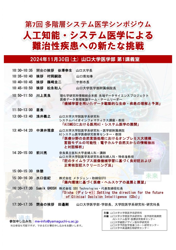 New Challenges for Intractable Diseases by Artificial Intelligence and Systems Medicine” will be held on November 30, 2024 in Lecture Room 1, 1F of the Medical School Building, Faculty of Medicine.