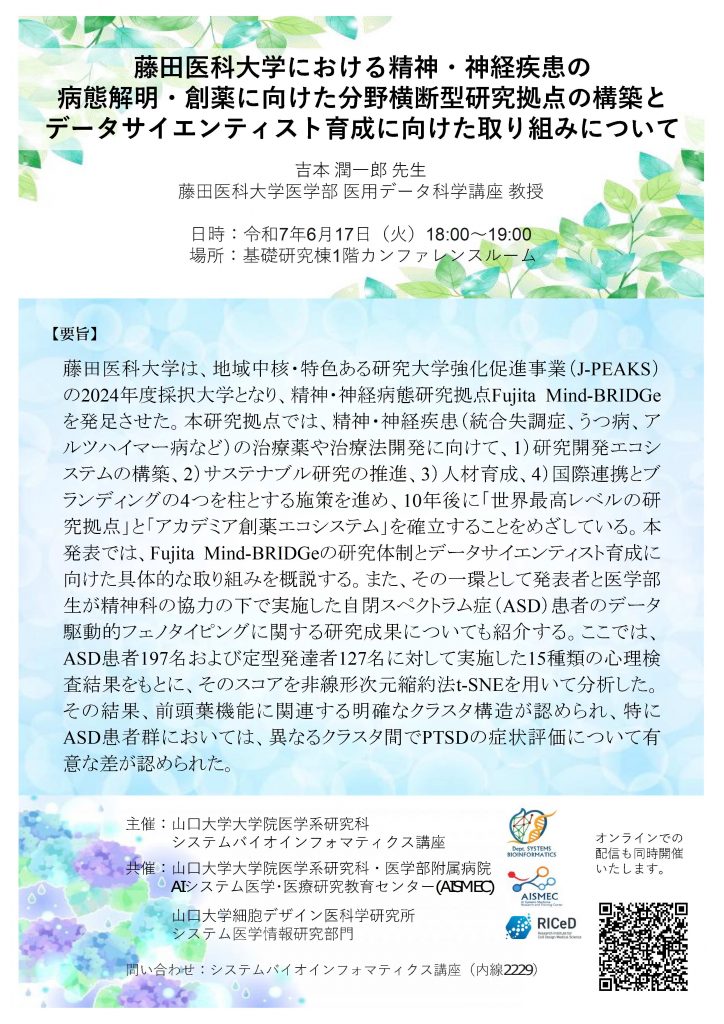 On Tuesday, June 17, 2025, we will hold a seminar entitled “Establishment of a Cross-Disciplinary Research Center for Pathophysiology and Drug Discovery of Psychiatric and Neurological Diseases and Training of Data Scientists at Fujita Medical College” at the Conference Room on the 1st floor of the Basic Research Building, Kogushi Campus.