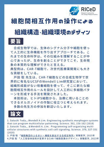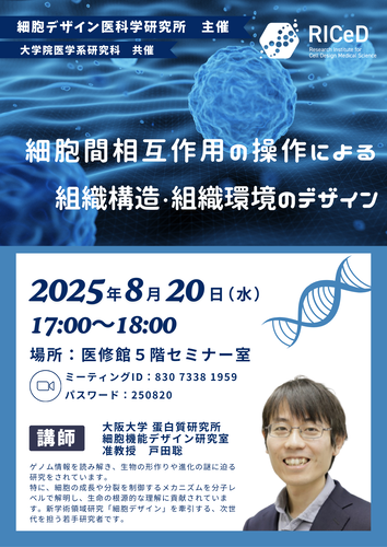 On Wednesday, August 20, 2025, a seminar titled “Designing Tissue Structure and Tissue Environment through Manipulation of Intercellular Interactions” will be held in the Seminar Room on the 5th floor of the Ishukan at the Kosugi Campus.
