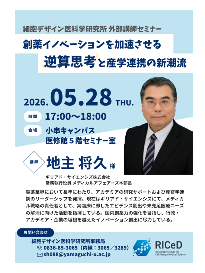 If you have any questions, please feel free to contact: Research Institute of Cell Design Medical Science (RICeD), Yamaguchi University (Research Institute Section, Life Science Support Division)