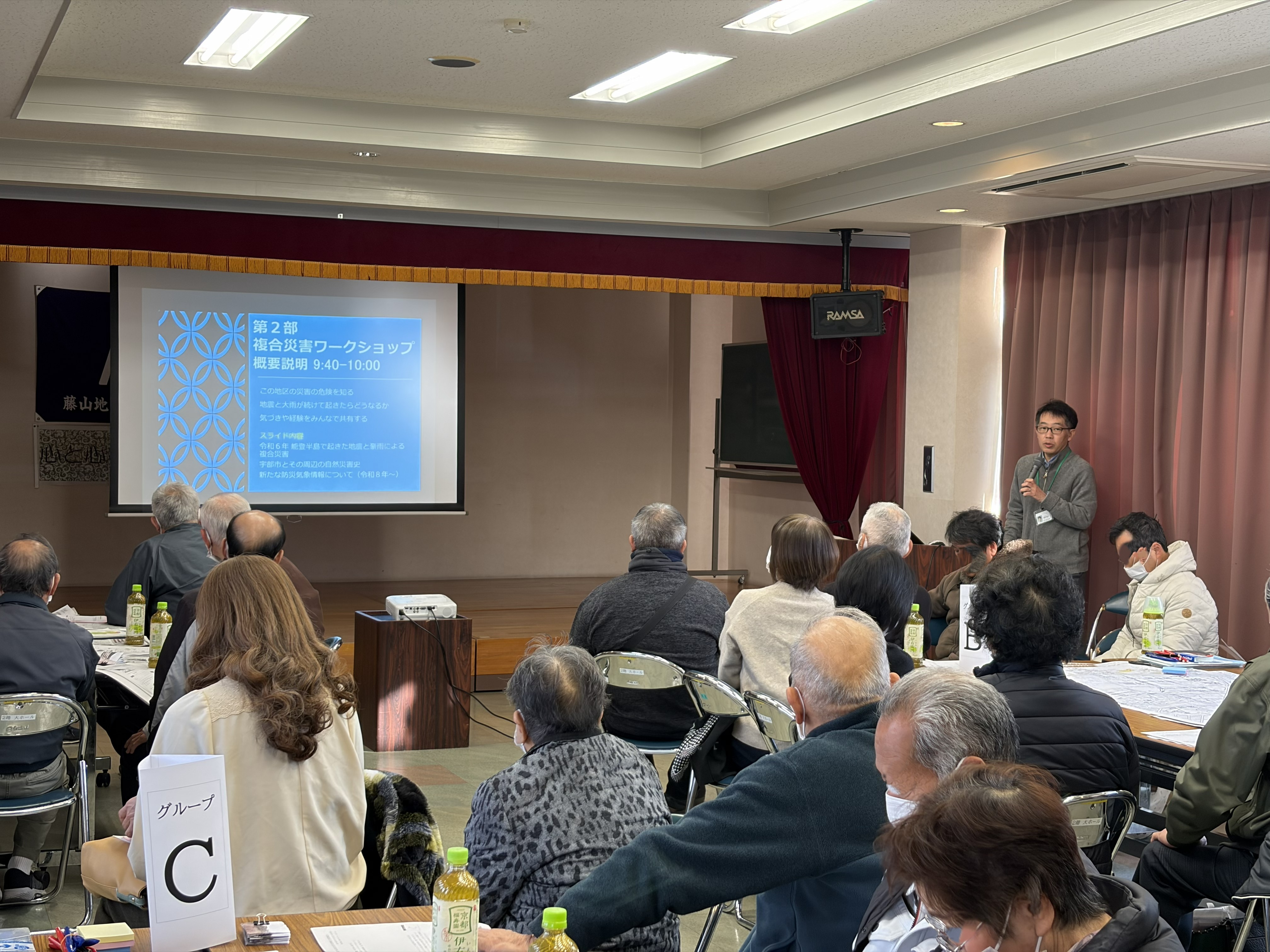 「令和7年度 藤山地区自主防災会研修会」(於 藤山地区ふれあいセンター)で開催され、その一環として、「複合災害の発生に対応した防災福祉コミュニティの創成」をテーマとしたワークショップが行われました。藤山地区と山口大学地域レジリエンス研究センター防災・減災グループとの連携によるもので、自主防災会、民生児童委員、まちの減災ナース約70名のほか、山口大学工学部、医学部保健学科からも学生14名が参加しました。