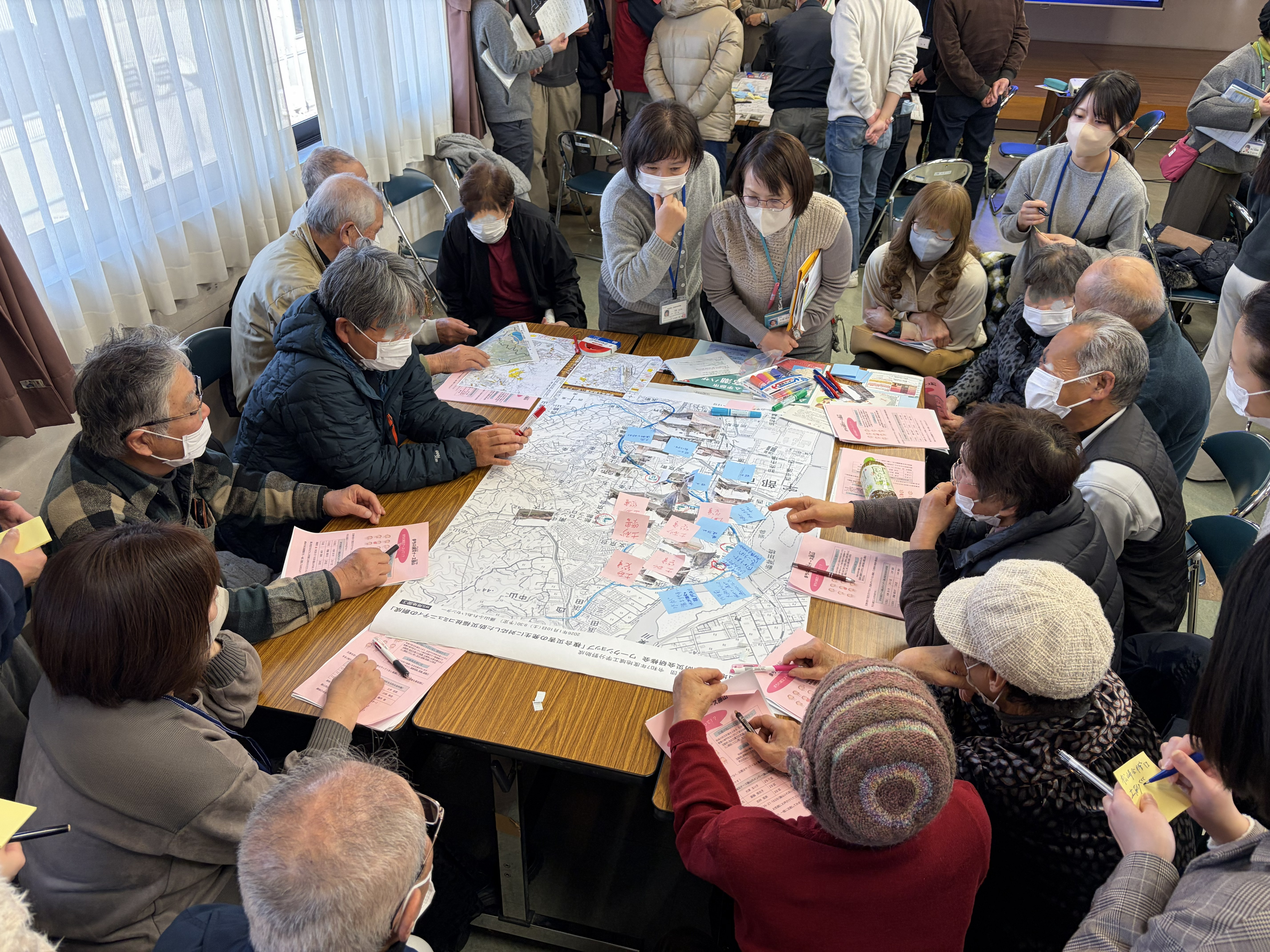 ワークショップでは、居住エリア別に4グループに分かれ、ハザードマップや体験等をもとに、浸水想定区域や土砂災害警戒区域等の危険箇所を確認後、拡大した白地図に書き込み共有しました。さらに、大地震後の大雨という複合災害発生の状況設定のもと、想定される被害やその時の避難経路、避難方法、避難行動要支援者の避難支援について検討を行いました。参加者からは、「避難場所に指定されていても、災害時にそこを活用できるとは限らないことに気づいた。そこに行けば安全だと思っていたが、そこまで行くことが大変だということに気づき、改めてどこに避難するか考える時間となった。」等の意見をいただきました。普段から地域の福祉活動に携わっておられる方々ですが、避難行動要支援者の把握の重要性を再認識され、どのような避難支援体制があるとよいか考える機会となったようでした。今後、避難支援の仕組みづくりについても一緒に考えていけたらと思います。