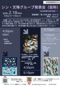 本発表会は“シン・文殊グループ”活動の集大成として毎年度末に開催しているものです。また、単に1年間の成果発表の場に留まらず、お互いの研究成果に対する意見交換の場、さらには、人的ネットワークの広がりの場として企画実施するものです。この会が参加者の皆様の異分野融合型共同研究のきっかけや人的交流の場となれば幸いに存じます。ご多忙の時期かと思いますが、皆様の参加をお待ちしております。