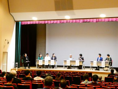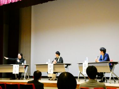 永岡克也テレビ山口アナウンサー、大來尚順超勝寺住職を迎え、本学部の小川仁志教授がファシリテーターを務め、「~ジャーナリストとお坊さんの課題解決~」をテーマに実施し、登壇者の軽妙な語り口に、会場は終始和やかな雰囲気に包まれました。