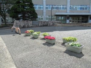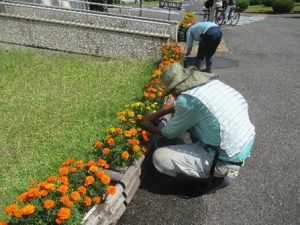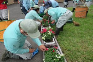 プランターを美しく保つために「花がら摘み」を行いました