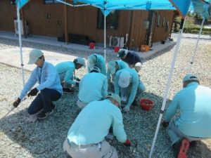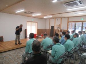 「日本を美しくする会―掃除に学ぶ会」の創設者である鍵山秀三郎氏の想いを伝承されている「鍵山記念館」を訪れ、研修を受講しました。講話では、心の荒みをなくすには、掃除をしてきれいにすれば、みんなが気持ちよく幸せになるというお話や、掃除道具の使い方、誰もがわかりやすい仕分けの工夫、声かけの仕方などについて、熱心にわかりやすいお話をいただきました。スタッフは、その都度うなづいたり、感心しながら、多くのことに気づくことができたようです。また、道具入れ倉庫の見学では、整理整頓と片付け、道具の手入れ方法等の説明を受け、草取り実習ではテントの影の活用、草取り道具の使い方、片付けと手入れの手順、水の節水など、たくさんの工夫を教えていただきました。気持ちを新たにして、今後の日々の実践に活かしていきます。