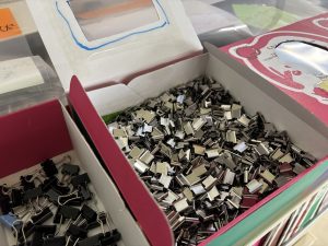 シュレッダーにかける前の事前準備として、シュレッダーの刃が痛まないように一つひとつの書類を丁寧に確認し、再利用可能な備品を手作業で根気強く仕分けました。整理した備品は、スタッフが室内作業の一環で作成した専用の入れ物にまとめ、総務部へ提供させていただきました。現在は総務部において、日々の事務運営のなかで活用されています。
