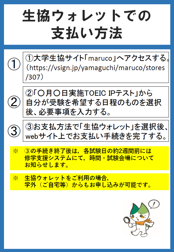 2026年6月7日(日)のTOEIC IP試験の申込から、生協ウォレットでの支払いが支払方法に追加されます。