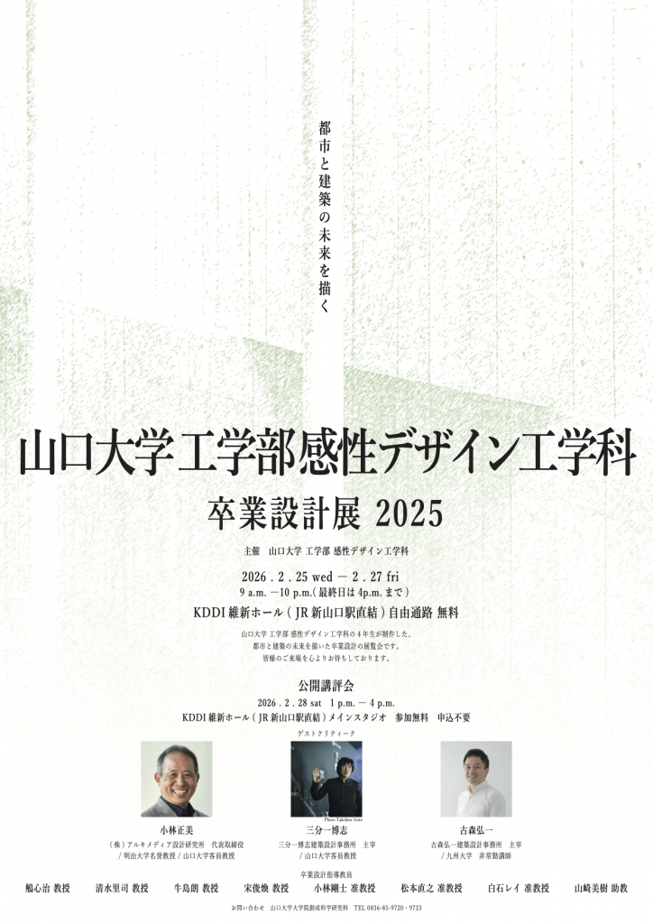 ●卒業設計展 2月25日(水)~27日(金) 午前9時~午後10時 (最終日は午後4時まで) 維新ホール(新山口駅直結)自由通路にて
