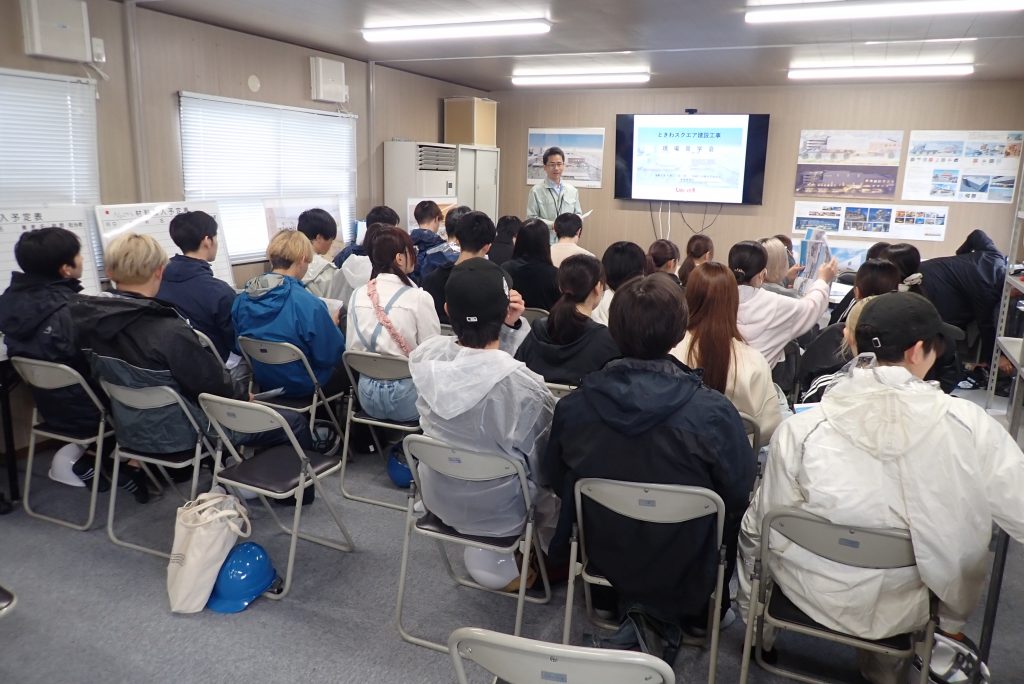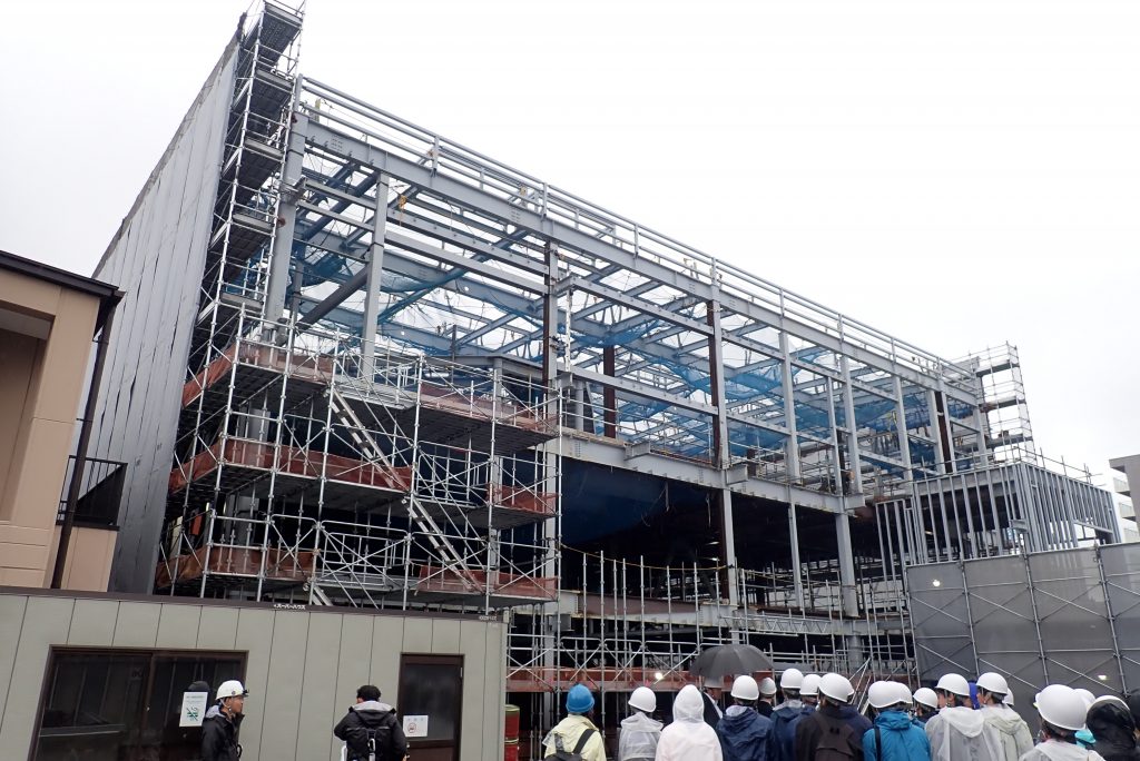 2026年4月23日(木)、感性デザイン工学科2年生を対象に、宇部井筒屋跡地に建設中の複合施設「ときわスクエア」の現場見学会を開催しました。現場事務所では、宇部市から事業計画を、設計事務所から設計概要を、施工業者から工事概要をそれぞれご説明いただきました。建物内では、鉄骨骨組、スラブ配筋、ブレースなどを見学しました。多くの学生にとっては建設現場の見学ははじめての経験だったと思います。熱心に話を聞き、建設現場に大いに感心を持った様子でした。建物の完成後には、是非、建物を訪問して欲しいと思います。見学会の開催にご尽力いただいた関係者各位に厚く御礼申し上げます。