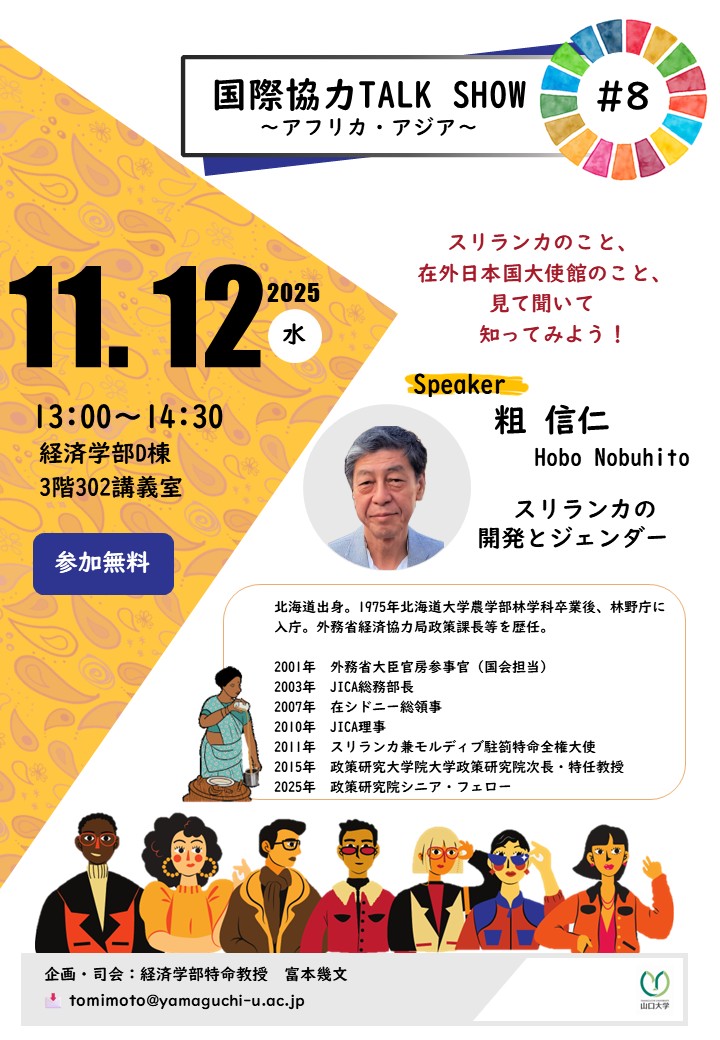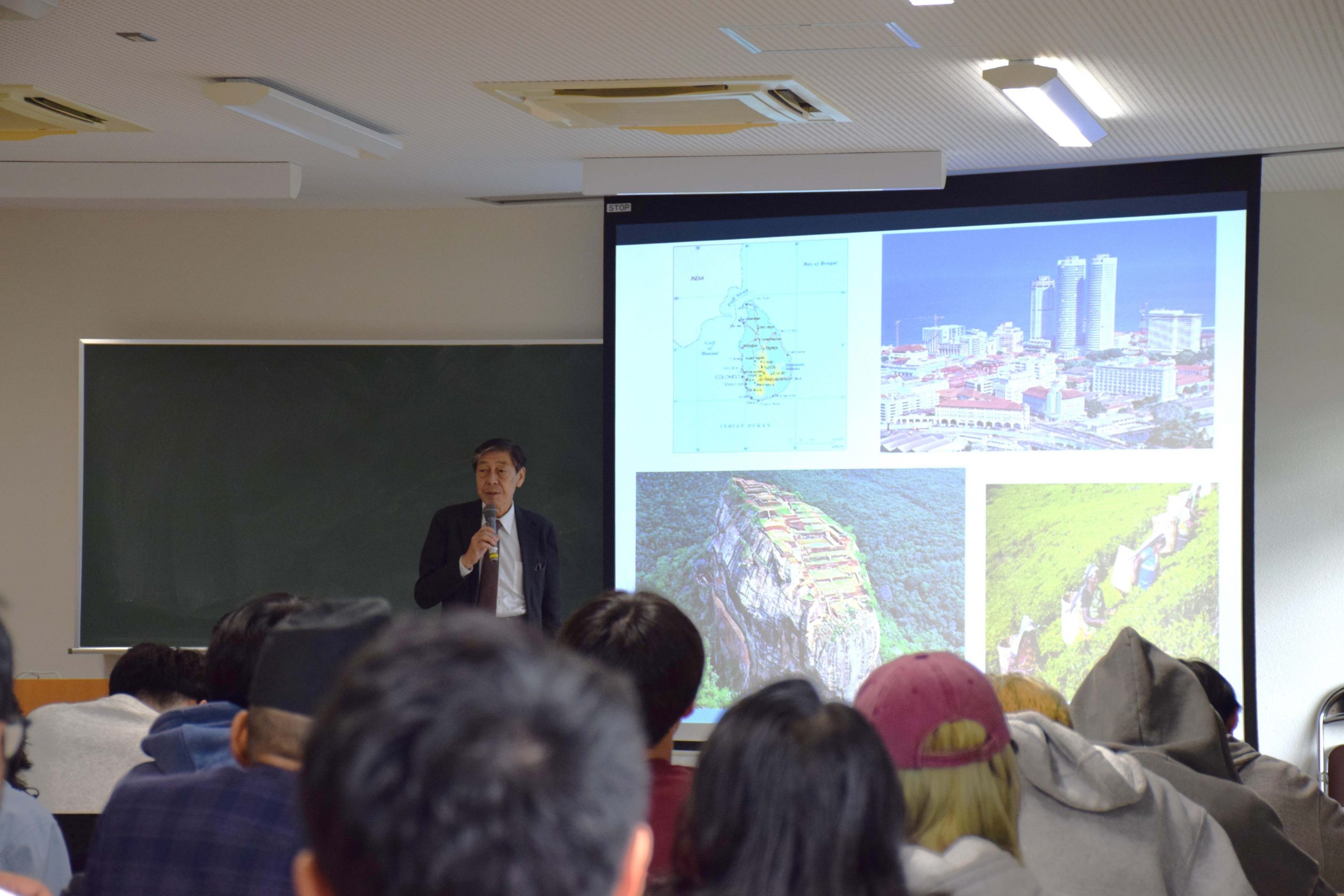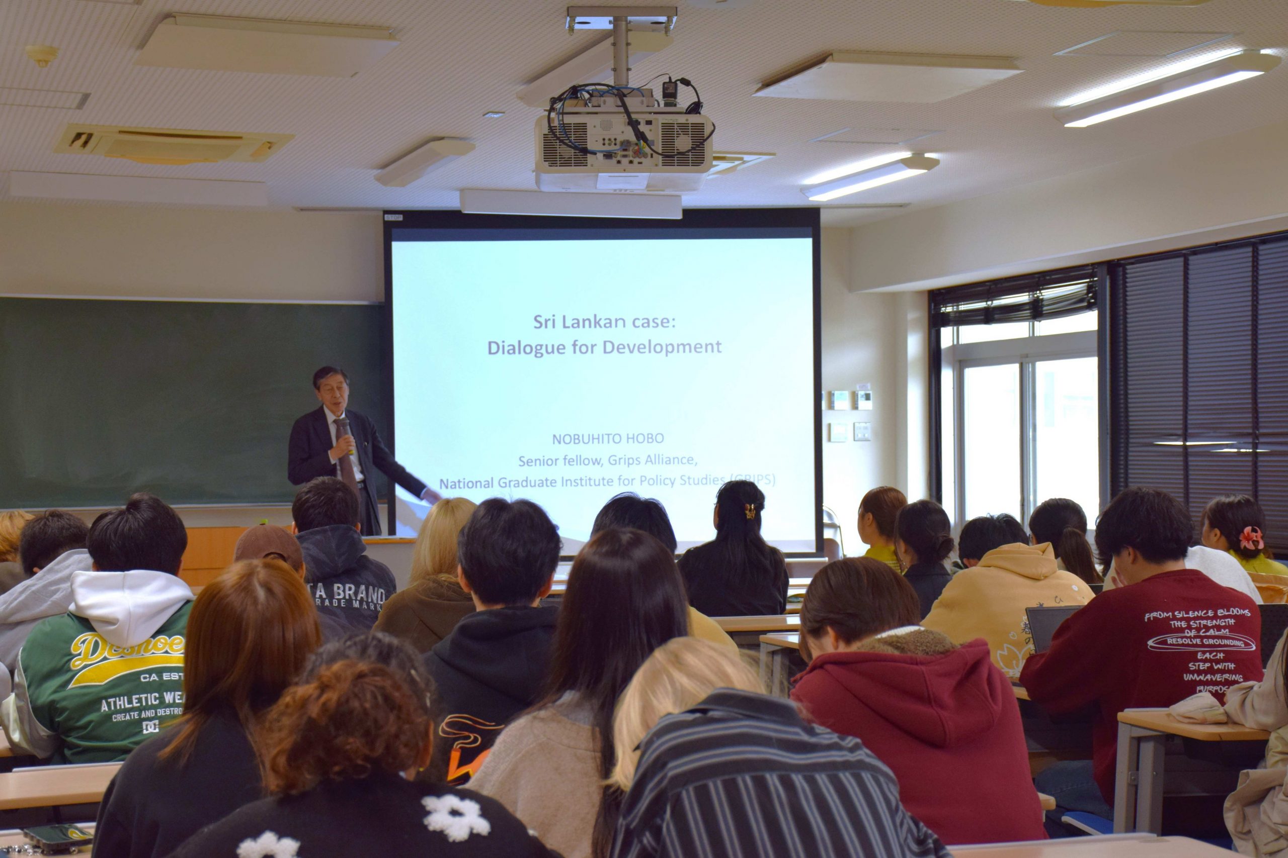 2025年11月12日(水)午後1時より本学経済学部D302号講義室において、元在スリランカ日本特命全権大使の粗信仁(ほぼ のぶひと)氏による「スリランカの開発とジェンダー」と題する講演会が開催され、学部学生と大学院の留学生を含めて約70名が参加しました。