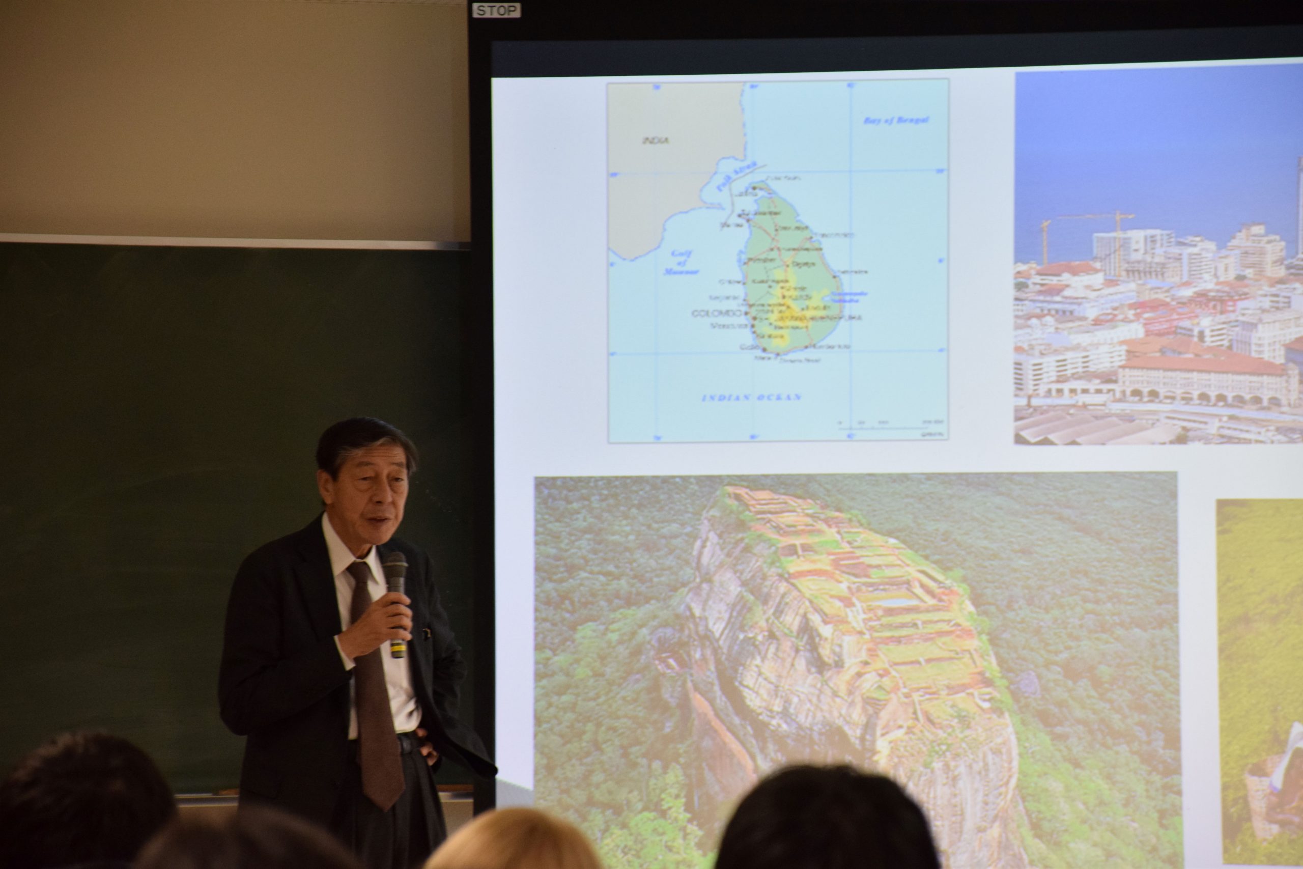 講演会では、スリランカのユニークな特徴として、同国がベトナムと同様に「民主社会主義共和国」を国名とし、福祉国家を目指し、大学教育までの無償化と医療皆保険を制度化していること、日本の5Sや「カイゼン」を導入していることなどが説明されました。