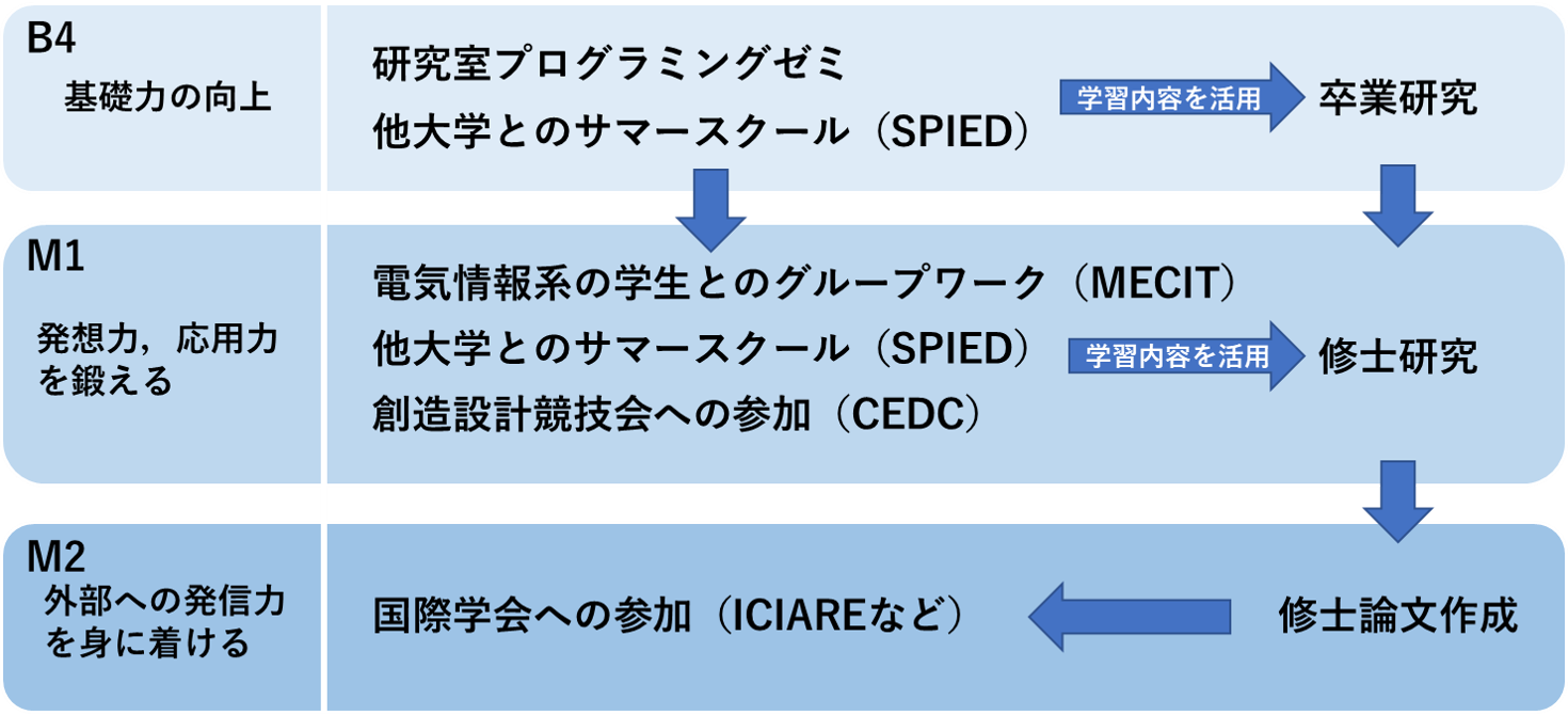 マイクロメカトロニクス研究室は大学院進学を推奨し,以下図の教育プログラムを実践して貰っています.