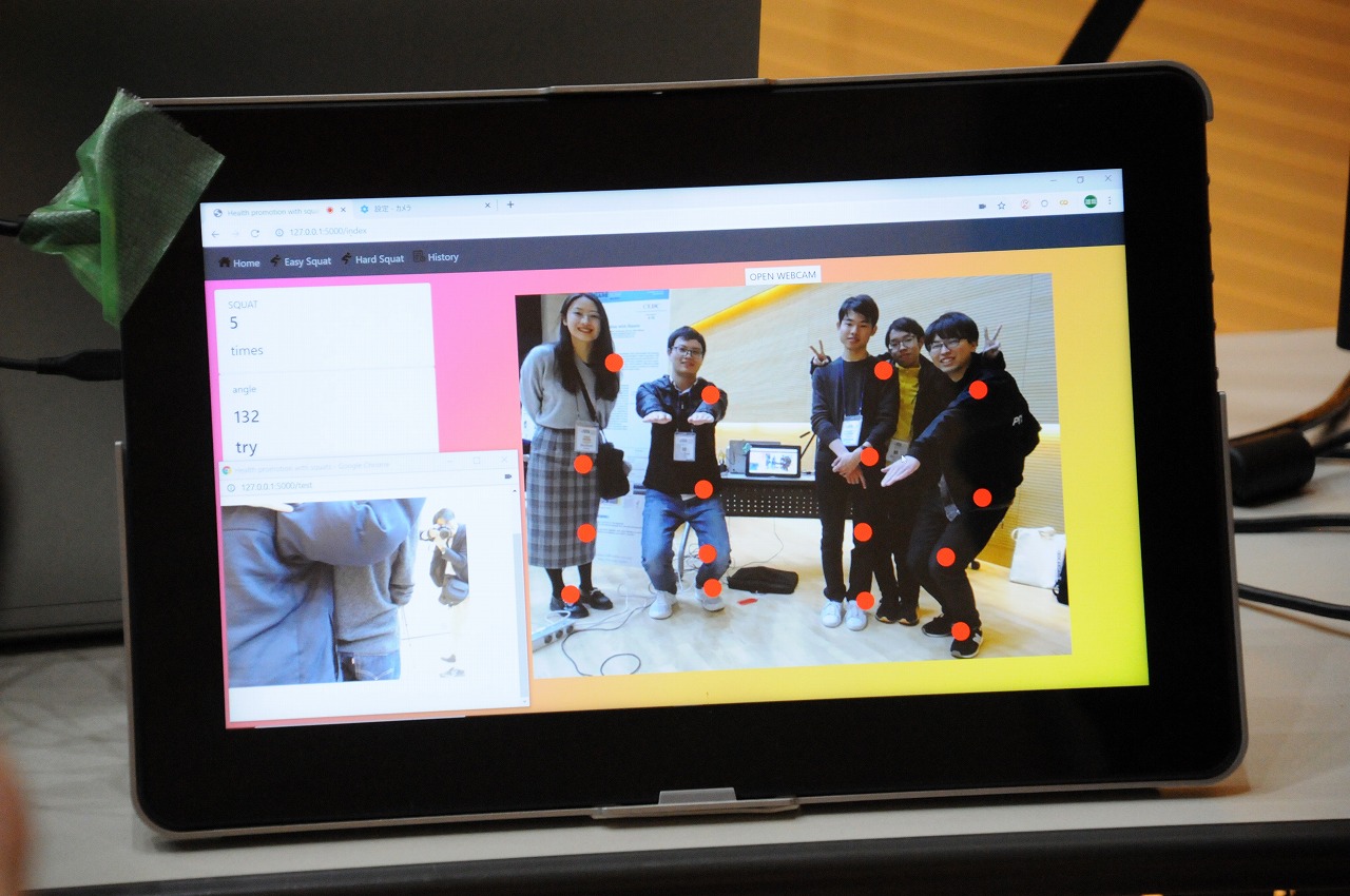 壹岐大輔(機械系),若本亮佑(知能情報系),鳥井 楓(電気電子系),Zhang Yang(四川大学錦江学院) - Health promotion with squats (スクワットによる健康増進システム):創成科学研究科修士1年作品