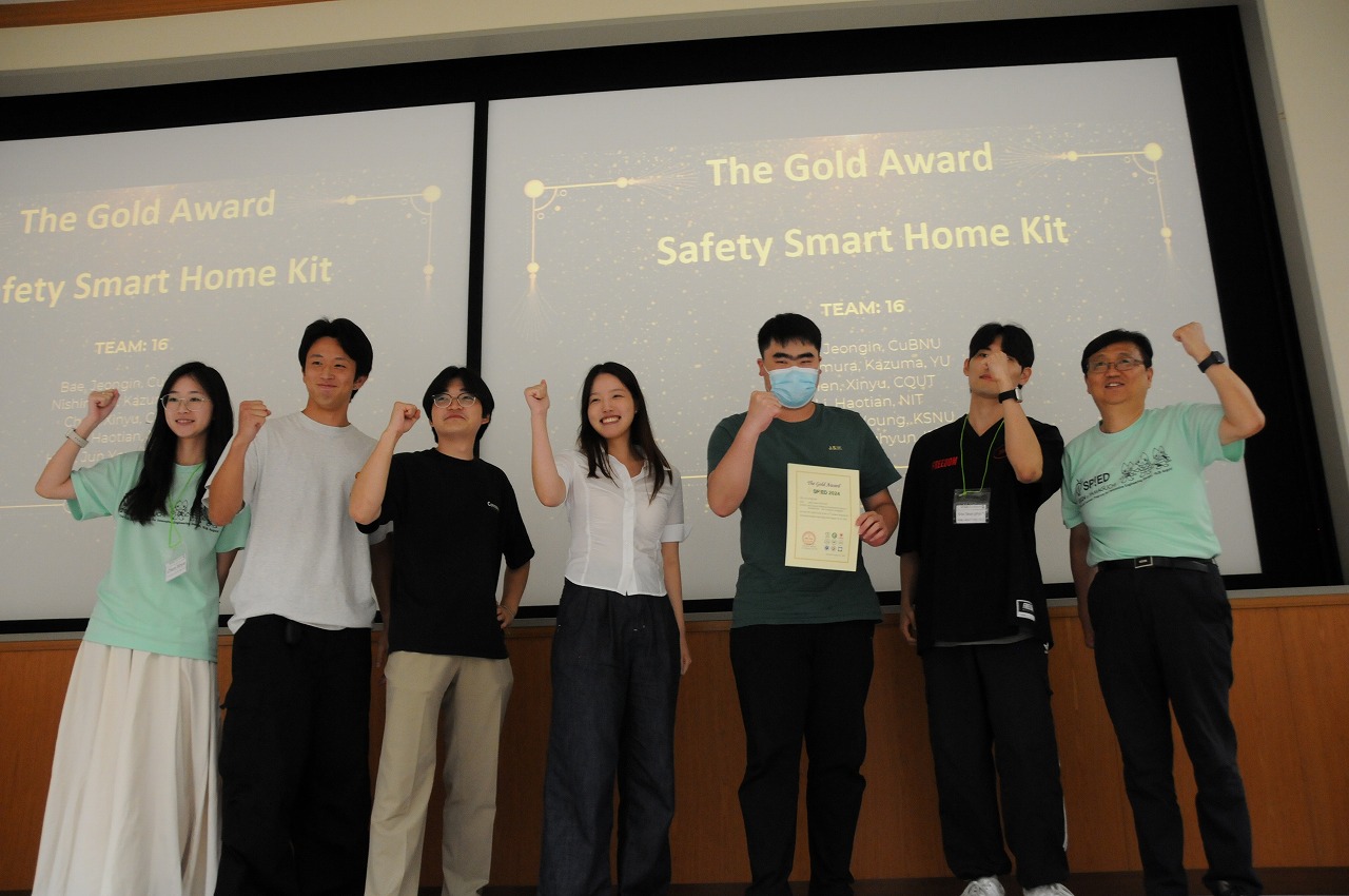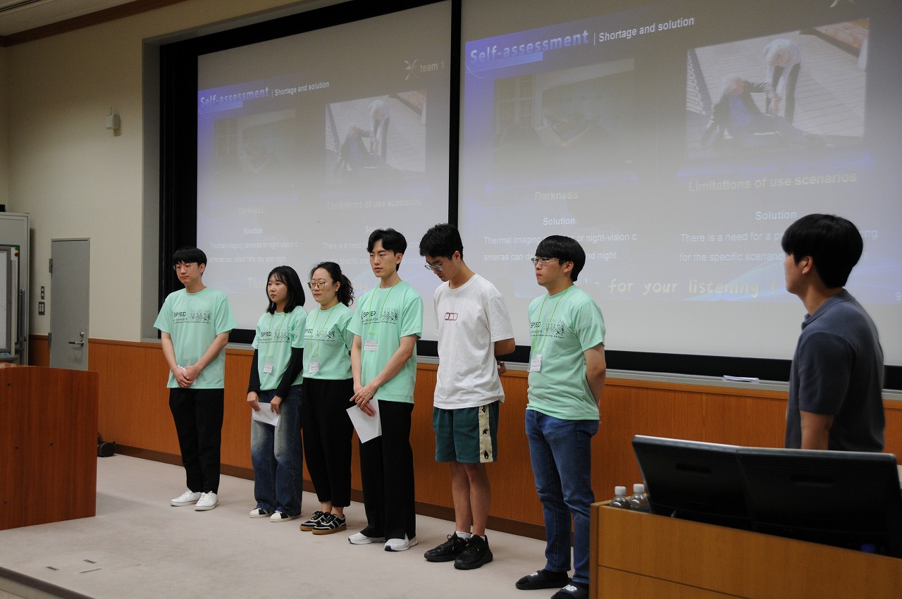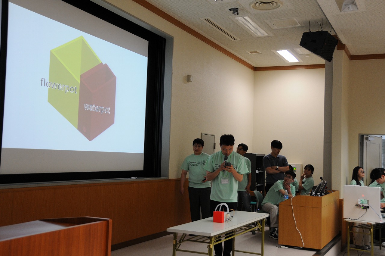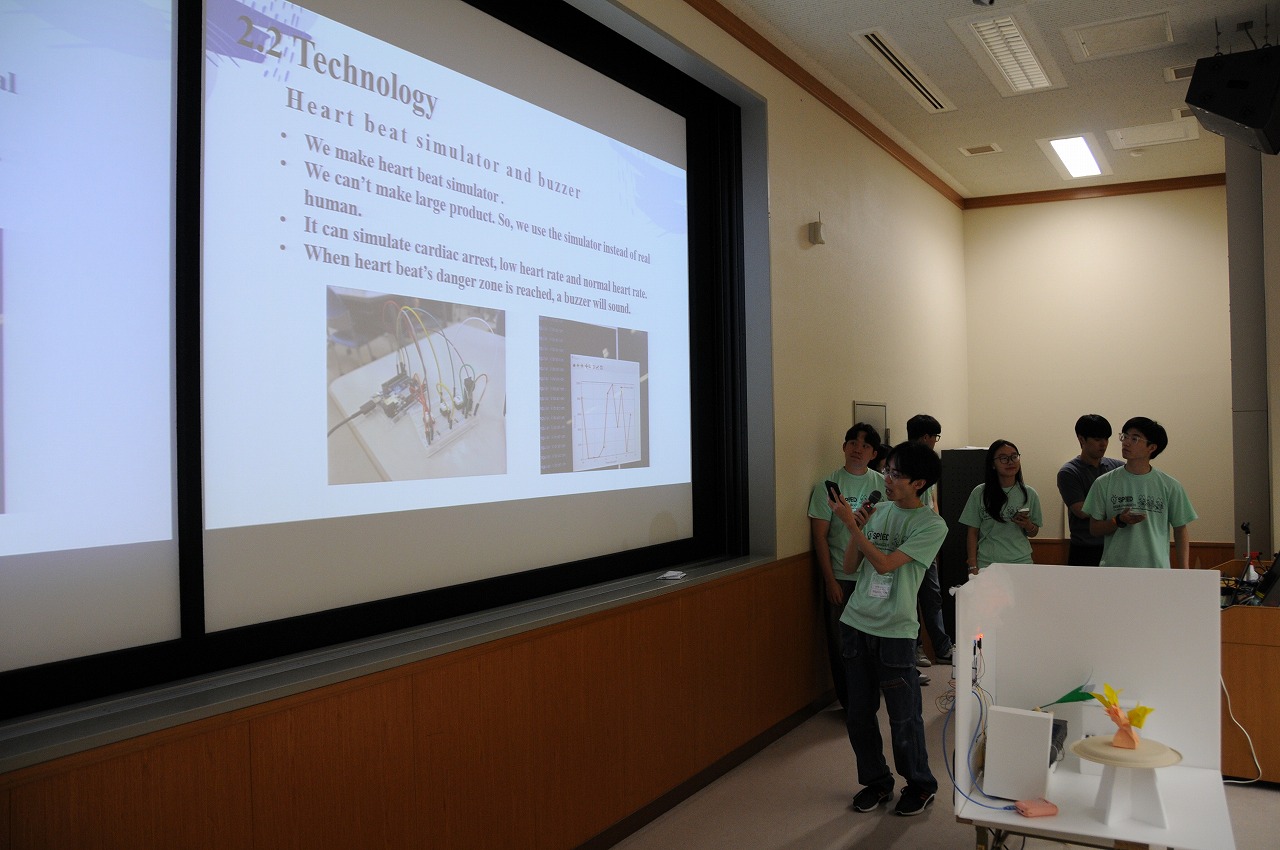 日本、中国、韓国の3か国から、合計10大学の学生111名と教員26名が参加しました。参加者の専攻分野は、機械、電気、情報系が中心ですが、芸術、数学、食品安全、化学、園芸科学、経済など、幅広い分野にわたっています。今年のテーマは「超高齢化社会に向けたスマートな解決策」(Smart Solutions for Super-Aging Society)で、学生たちはテーマに基づいて革新的なアイデアを考え、実際に試作品を制作することで、現実の課題に対する解決方法を模索しました。
