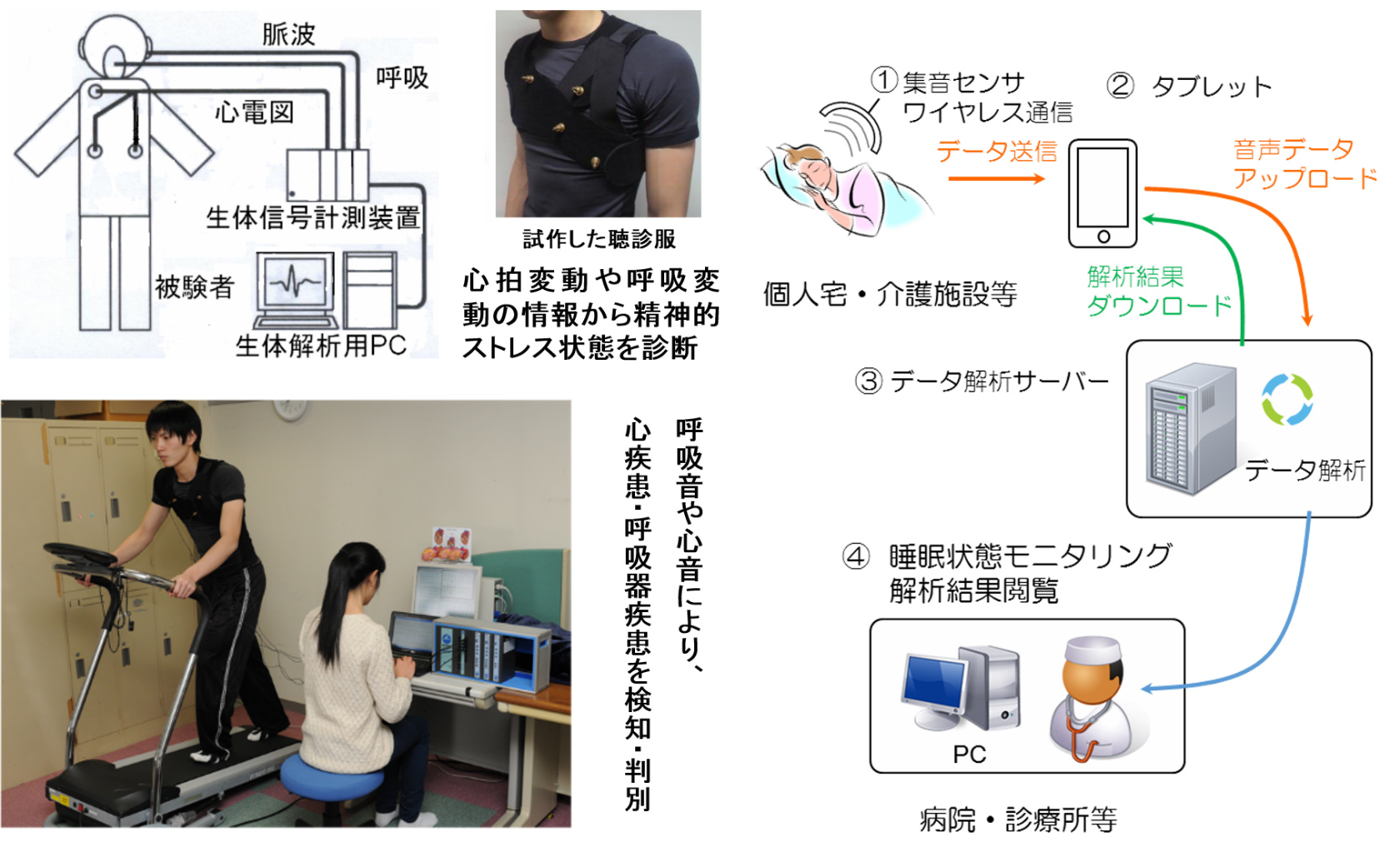 呼吸や心拍などの生体情報を長期間にわたりモニタリングすることで,”睡眠の質”や”精神ストレス”を解析しています.本研究を通して,心肺音・心電計測技術およびその信号処理技術,健康情報解析技術を学び,新しい診断技術を開発していきます.