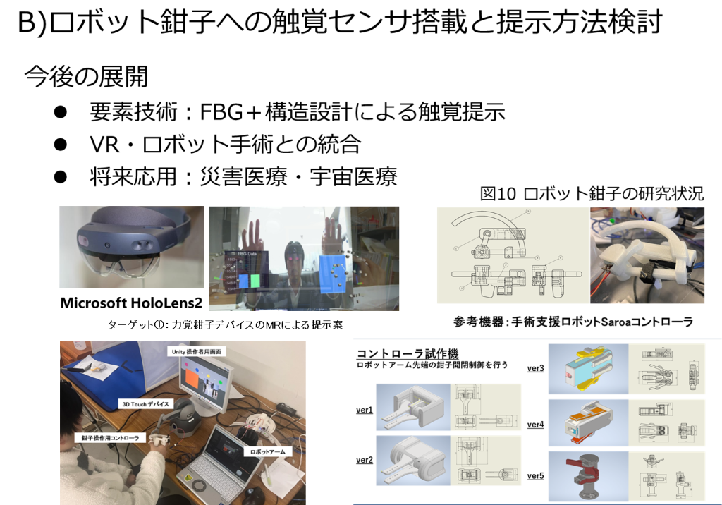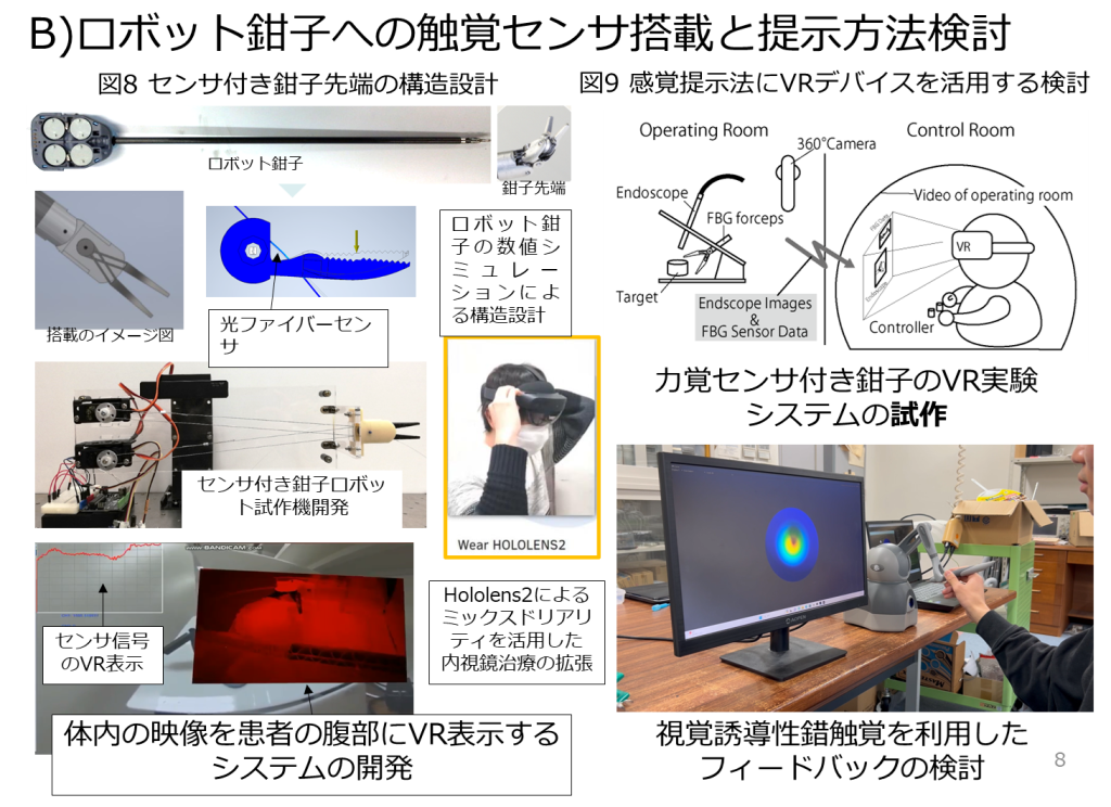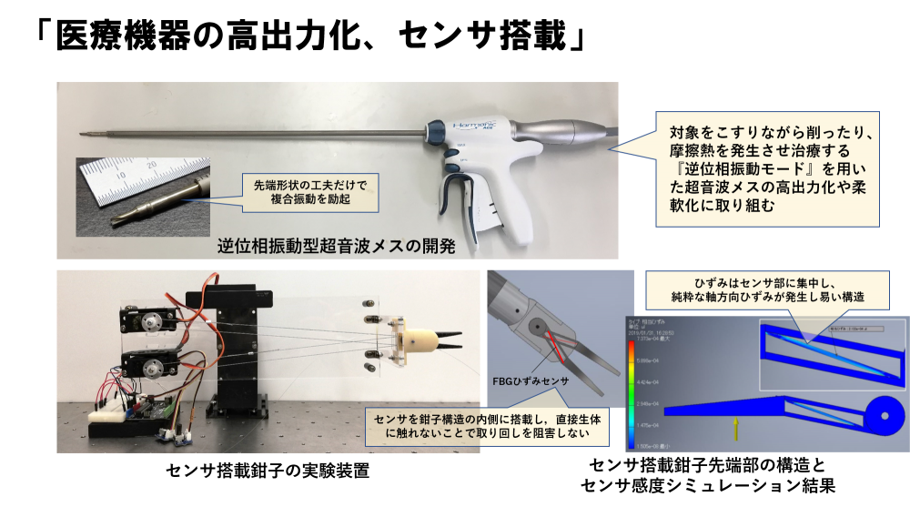 医師の触覚が失われる内視鏡やロボットを用いた手術において、触覚を計測するセンサの開発および、医師へ触覚感覚を提示する方法について研究している。
