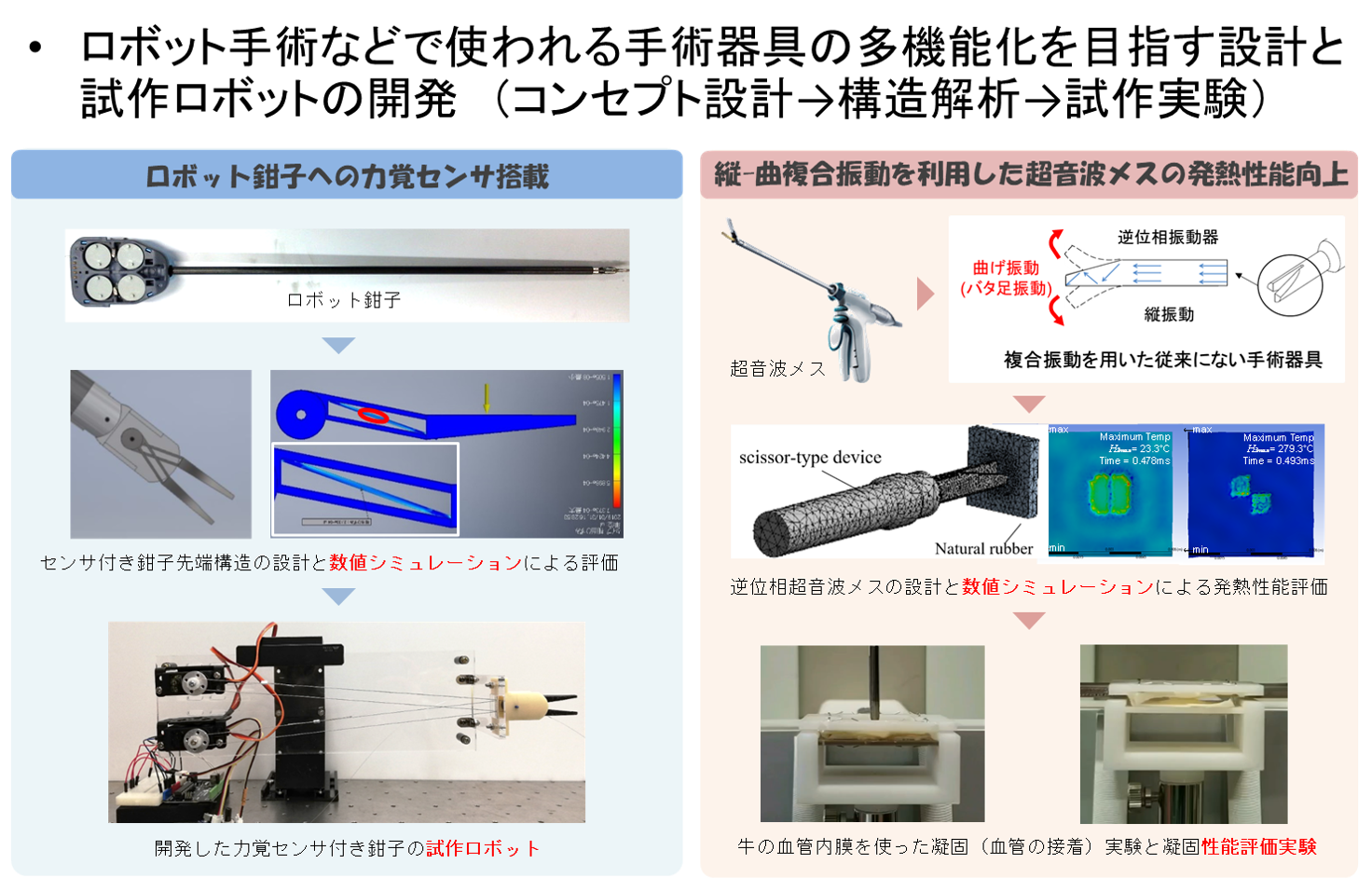 超音波メスで血管内膜を凝固させながら切開する実験(左)と凝固させた2枚の血管内膜の接着力を評価する実験(右)