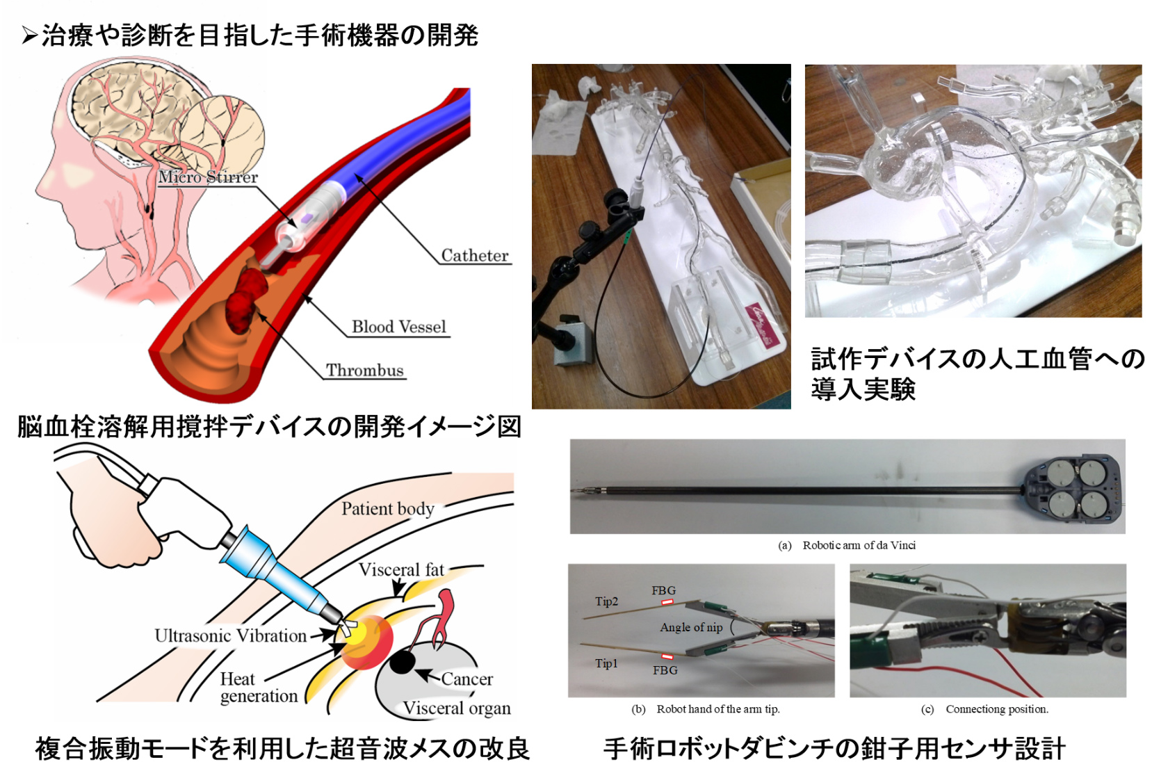 滅菌可能で防水性に優れたFBGひずみセンサの特性を生かし、カテーテルに搭載して治療診断中の生体内の情報を計測する試み。県内の医療機関御協力のもと臨床研究も行っている。