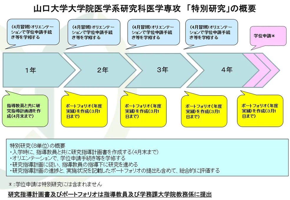 山口大学大学院医学系研究科では、入学後1か月以内に、課程修了までの研究指導計画を指導教員と相談の上作成し学務課に提出することになっています。研究指導計画に変更が生じた際は、その都度学務課に提出願います。研究指導計画書の作成は、「特別研究」(必須科目)の一環となっております。