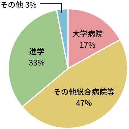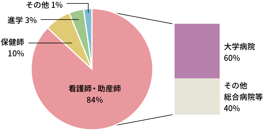 看護学専攻の約80%、検査技術科学専攻の約70%は大学病院や総合病院へ就職します。