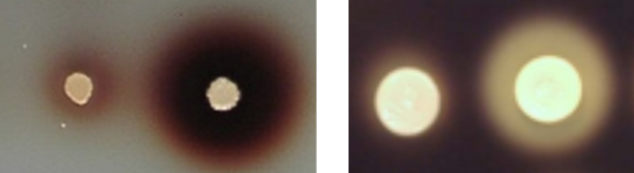 タンパク質を生産させる酵母の遺伝子を改変して,タンパク質生産量を増強した。左はラッカーゼという酵素,右はアミラーゼ。中央の白い円形が組換え酵母部分,その周りの赤茶色,薄い黄色の範囲が広いほど酵素をたくさん生産している。