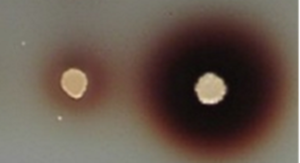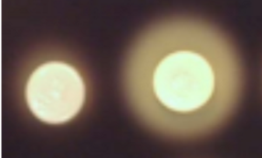 タンパク質を生産させる酵母の遺伝子を改変して,タンパク質生産量を増強した。左はラッカーゼという酵素,右はアミラーゼ。中央の白い円形が組換え酵母部分,その周りの赤茶色,薄い黄色の範囲が広いほど酵素をたくさん生産している。