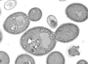 は酵母の中でも出芽酵母を呼ばれる酵母です。左の電子顕微鏡像で楕円や円形をしているのが,酵母の細胞。それらが2つ繋がっているのは,細胞分裂をしようとしている酵母です。拡大画像では細胞内にミトコンドリアも見られます。
