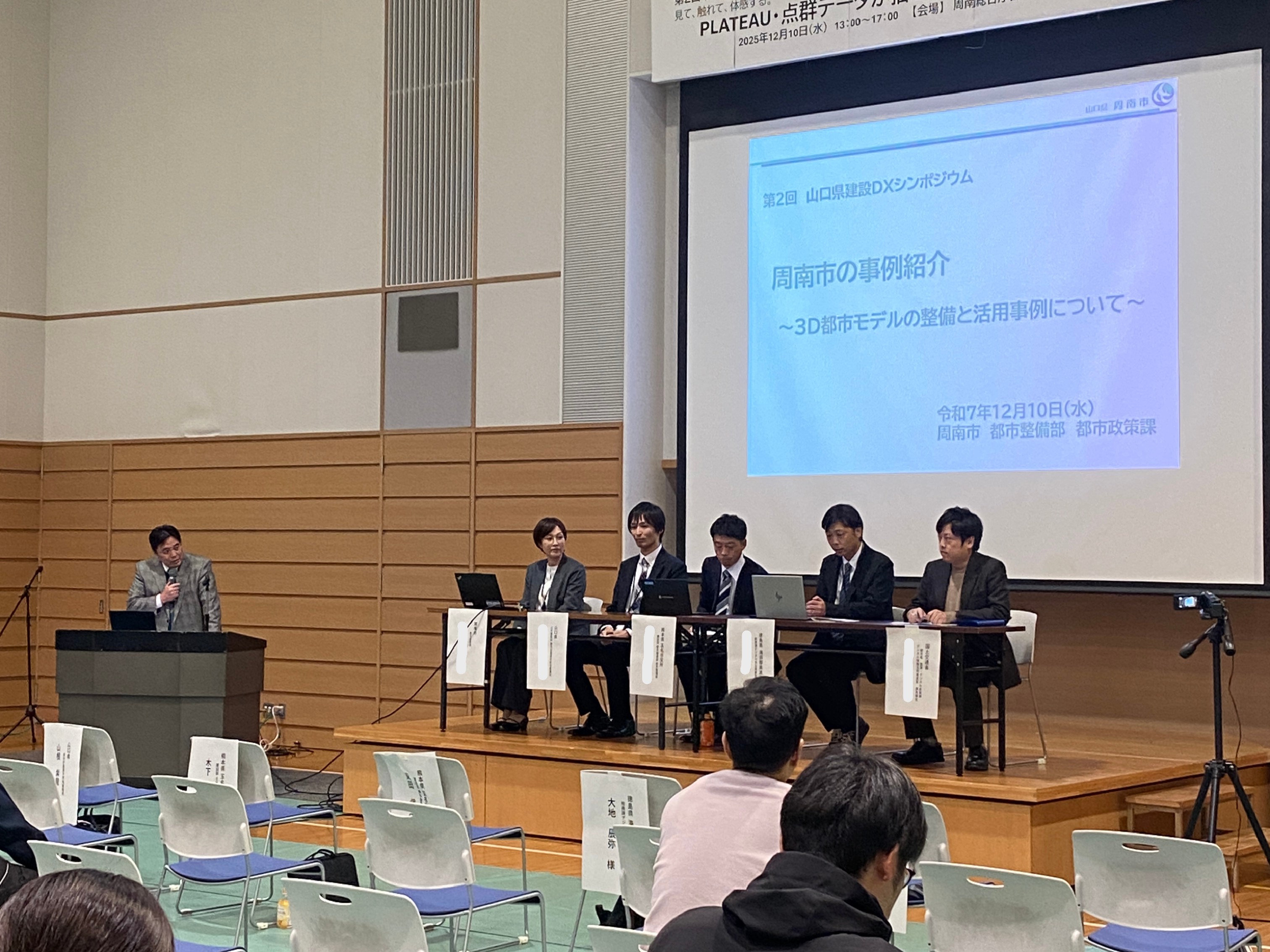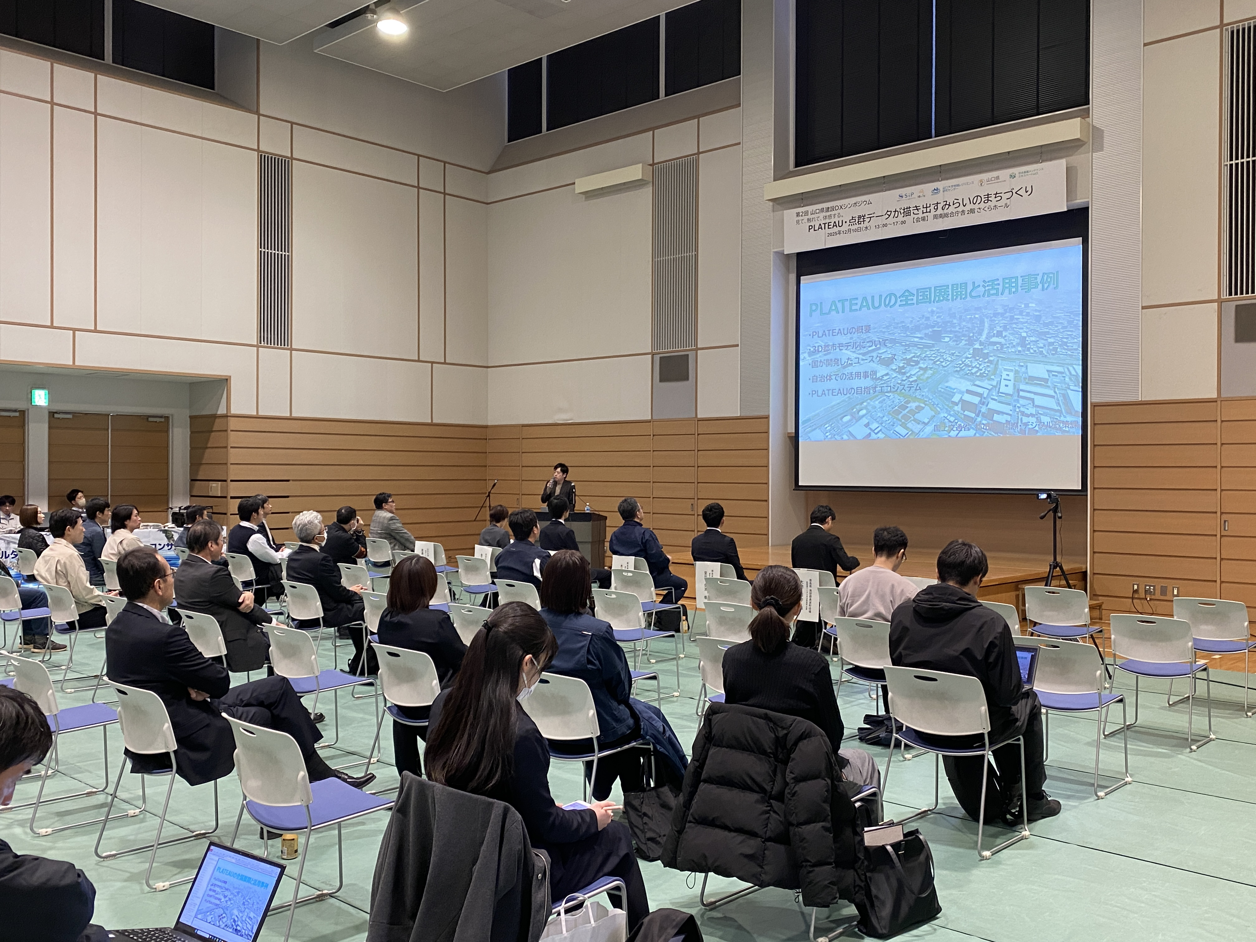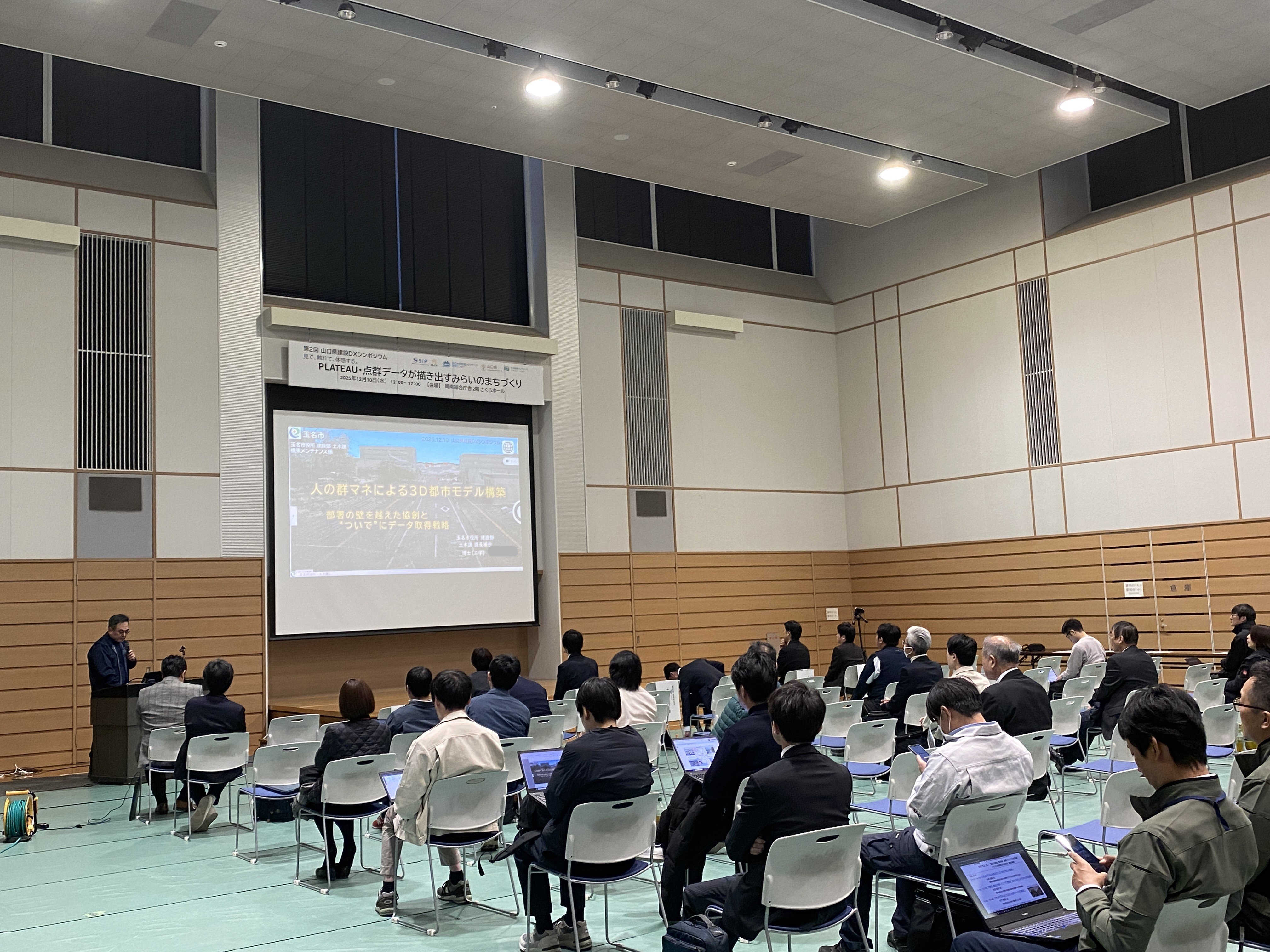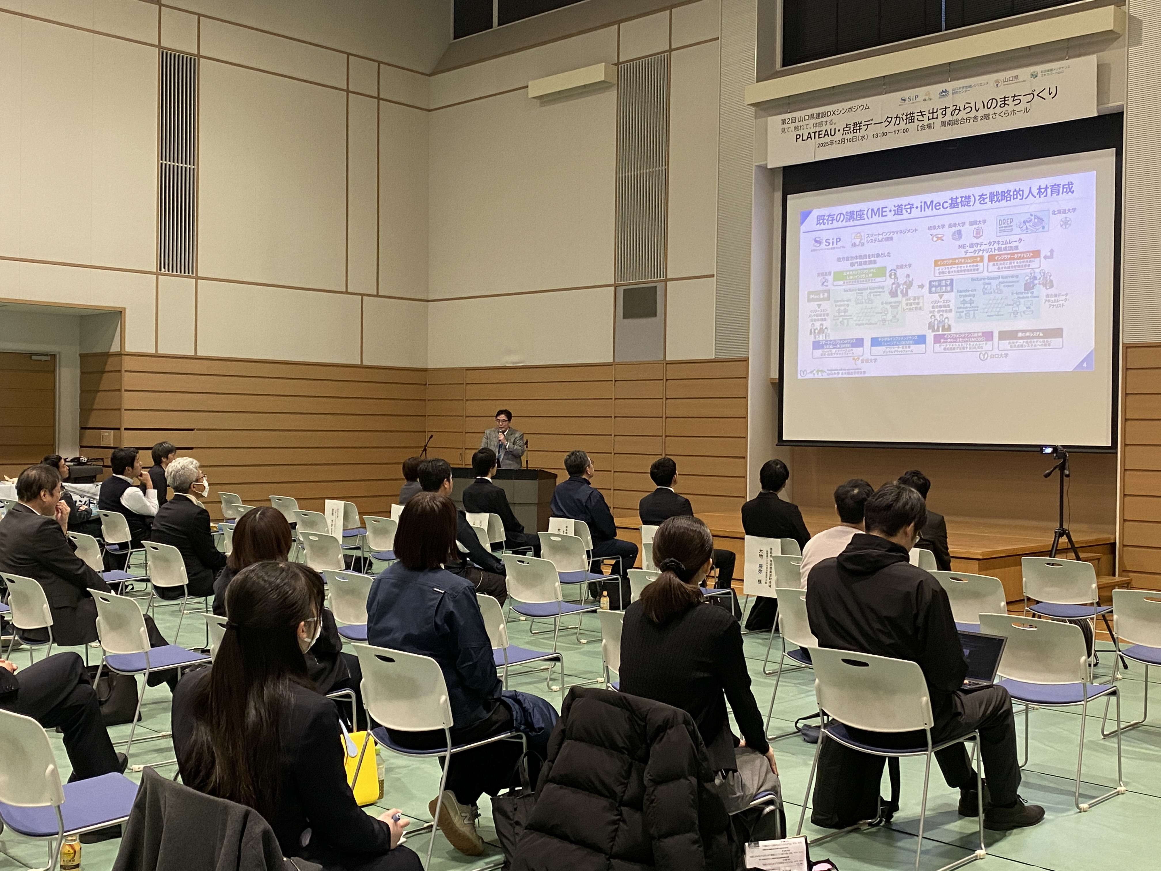 令和7年12月10日(水)にシンポジウム「第2回山口県建設DXシンポジウム」が、周南総合庁舎2階さくらホールにて対面開催されました。(主催:山口大学地域レジリエンス研究センター、山口県土木建築部技術管理課、共催:SIP〔戦略的イノベーション創造プログラム〕、社会基盤マネジメント教育研究センター)