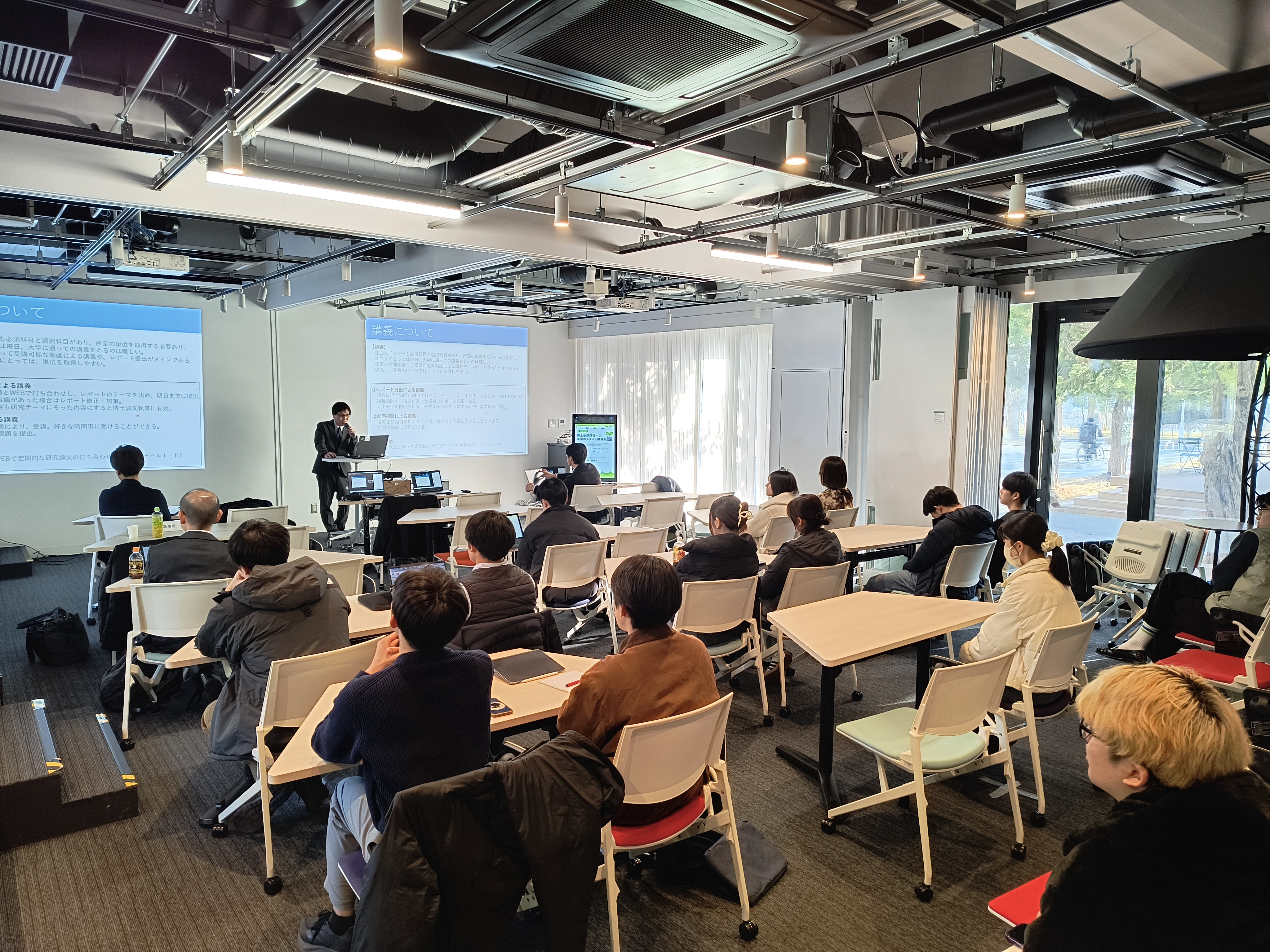 令和6年12月11日(水)に、「令和6年度 博士後期課程への進学のススメ!講演会」が開催され、会場では学生含め17名が、Zoomでは企業から36名が参加しました。