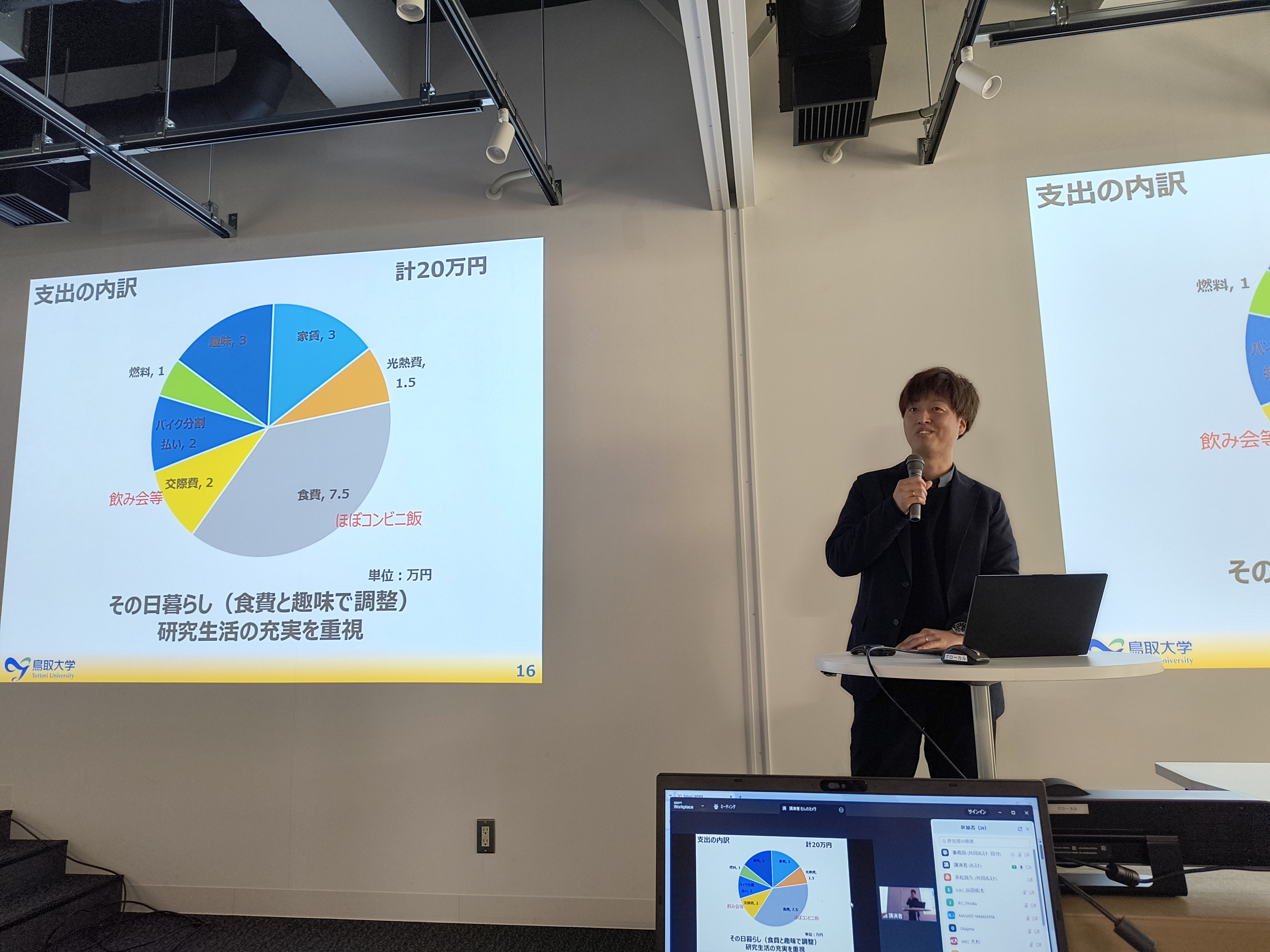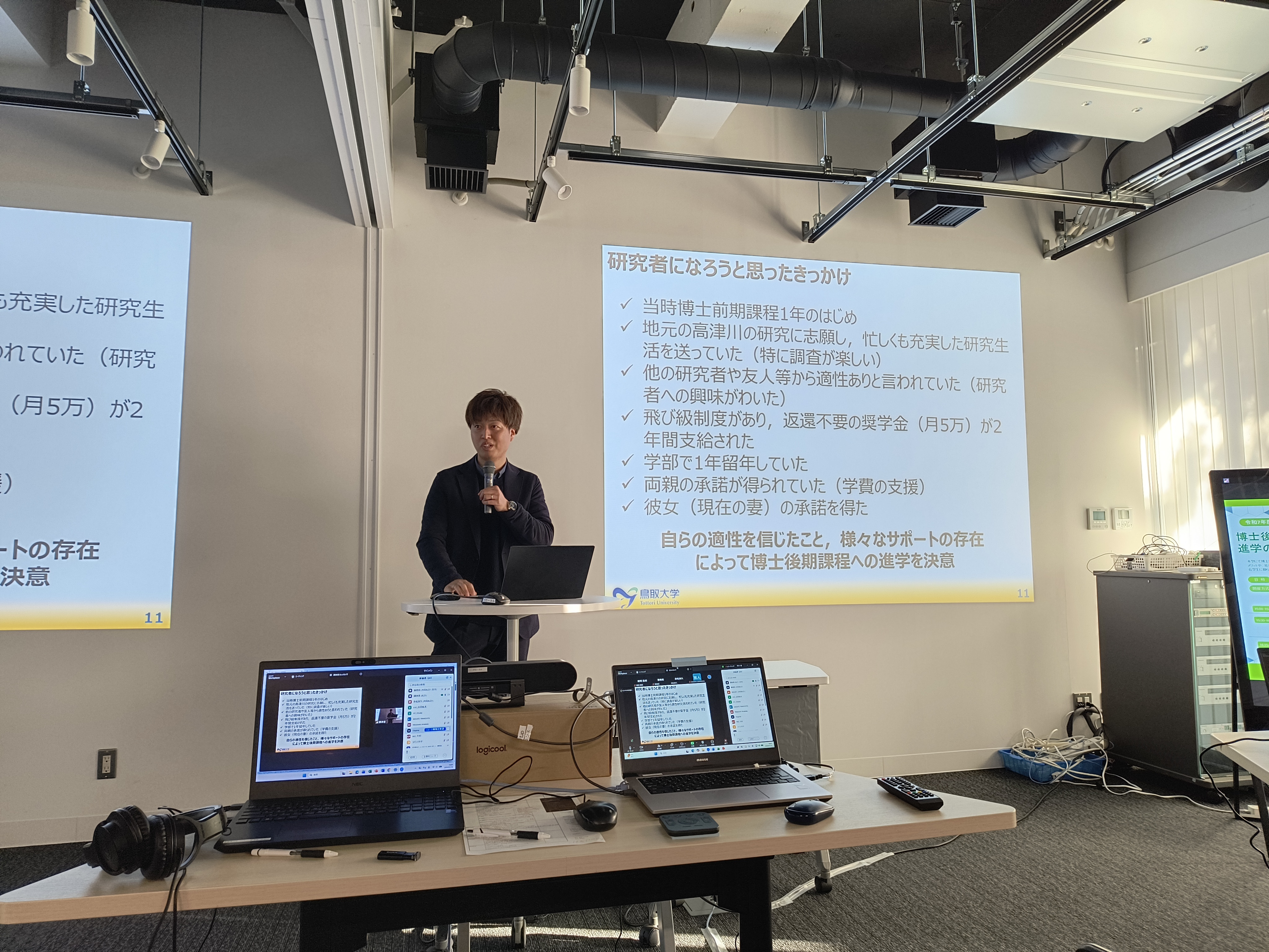 講師の株式会社エイト日本技術開発の後根裕樹氏からは、社会人ドクター経験者の視点から、博士課程進学のきっかけ・メリット・デメリット、さらに仕事と両立する博士課程生活についてお話いただきました。講師の鳥取大学の河野誉仁先生からは、学生時代の生活(調査・研究、1日の流れ、奨学金)と、社会人になってからの変化(仕事や心境、家庭)について、プライベートな話題も交えながらお話いただきました。