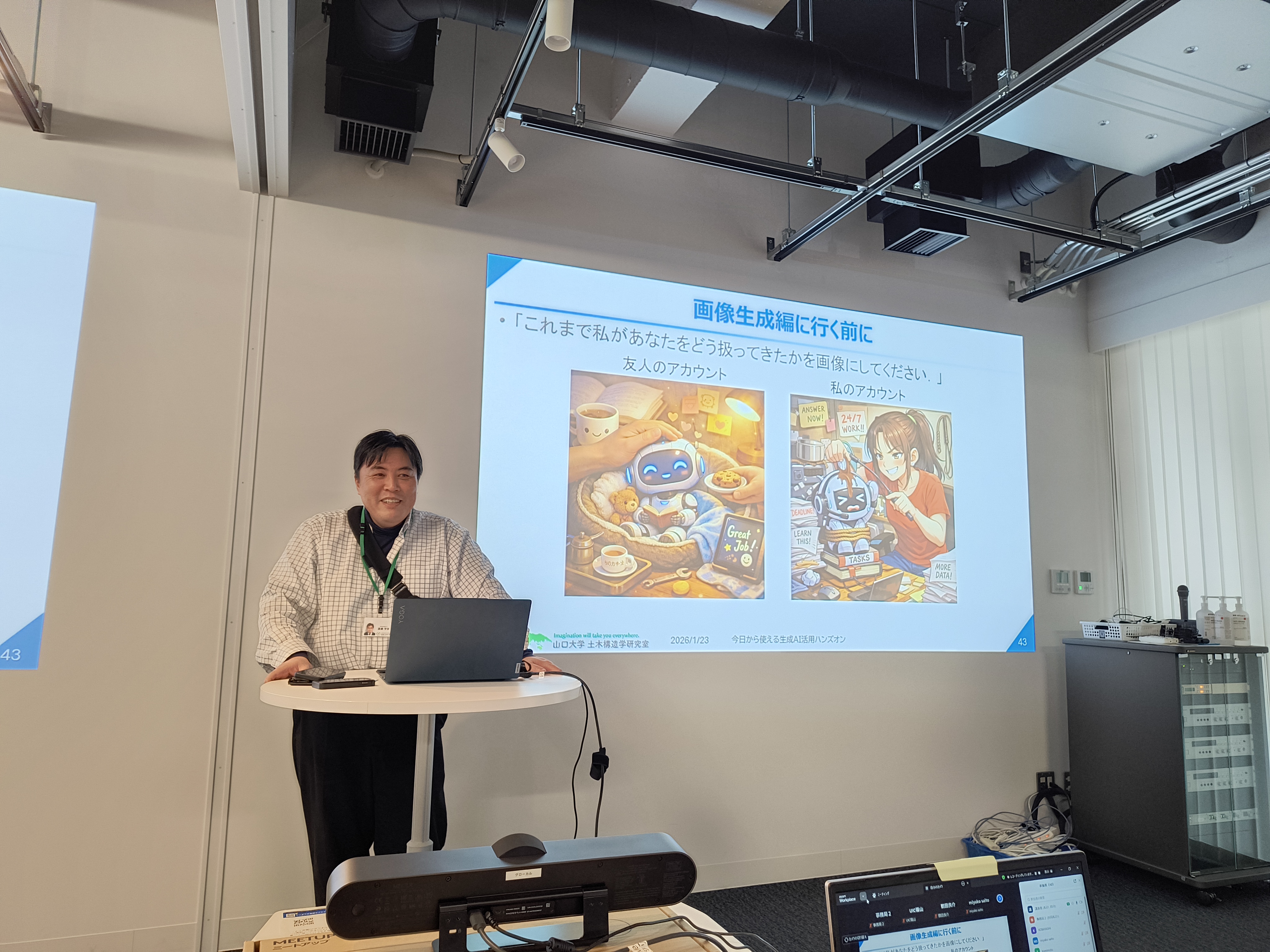 山口大学創成科学研究科建設環境系専攻の渡邊学歩准教授から、AIの回答を鵜呑みにせず、AIを主体的に活用・育成しながら生産性を向上させるための、幅広い話題をご提供いただきました。画像生成に関しては、AIへの指示の出し方を交えながら、複数の生成AIツールを活用した具体的な事例が紹介されました。