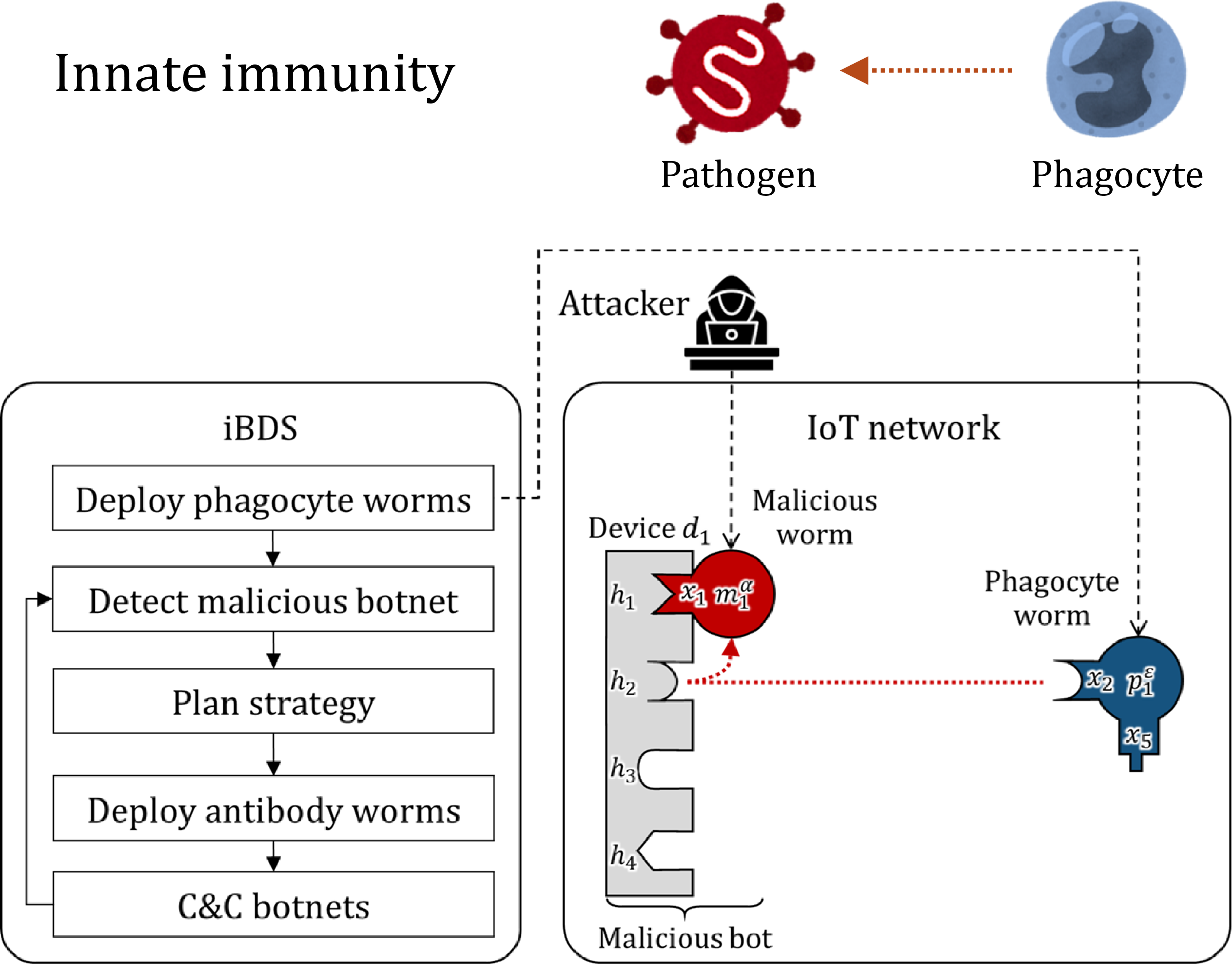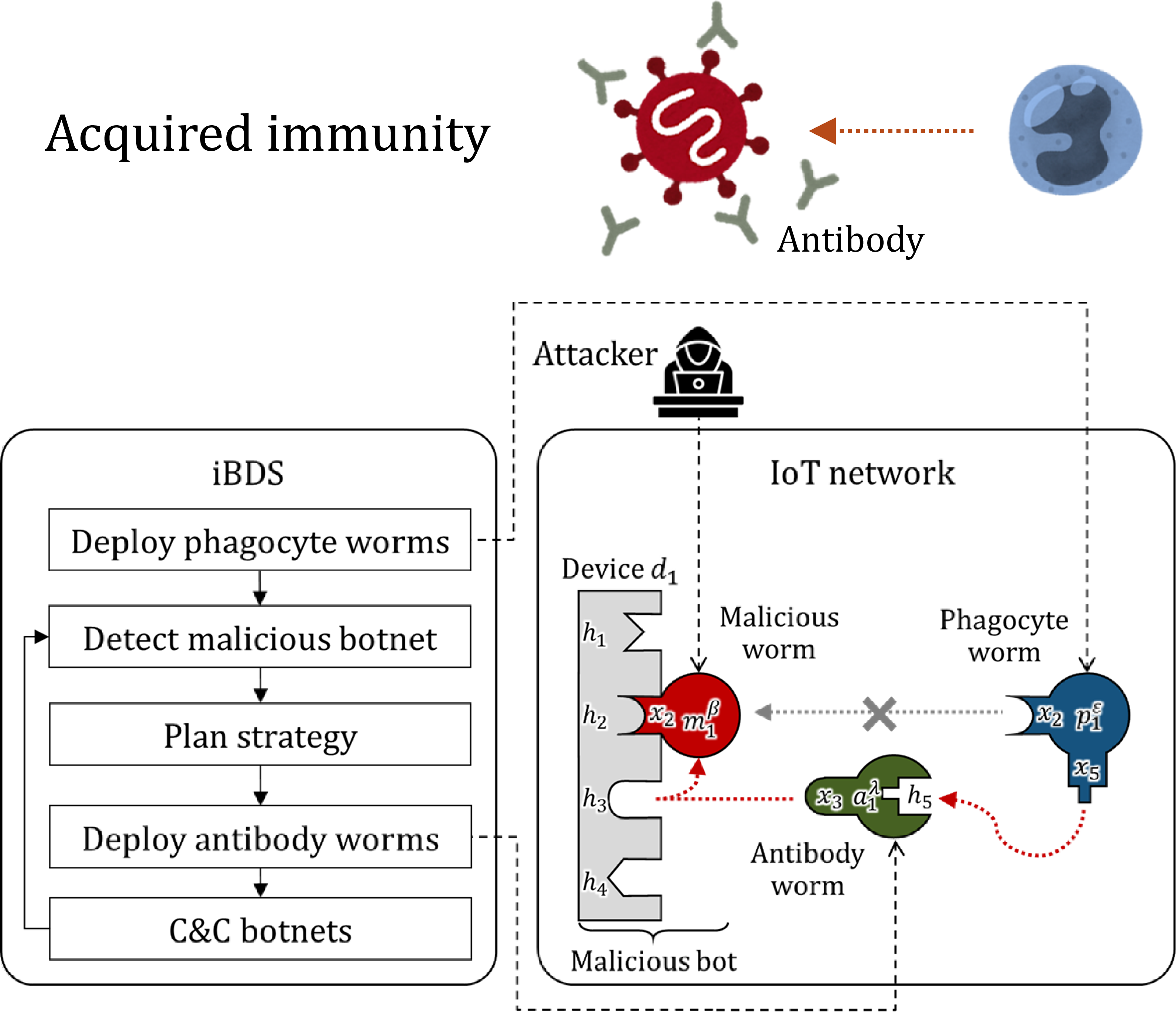 iBDS is an extension of BDS that introduces a new defense mechanism inspired by the bioimmune response, effectively eliminating botnets that repeatedly infect IoT networks. Focusing on the roles of antibodies and phagocytes in the immune response, iBDS implements multi-layered defense using two types of worms: antibody worms and phagocyte worms. When a malicious botnet infects a network, resident phagocyte worms immediately infect and eliminate the bots, preventing the spread of infection in its early stages. This provides an immediate response similar to that of innate immunity. On the other hand, if a malicious botnet infects the network and the phagocyte worms cannot infect the bots, the antibody worms will instead infect the bots and modify their vulnerabilities to enable the phagocyte worms to infect and eliminate them. This provides an adaptive response similar to acquired immunity. Furthermore, if the same botnet repeatedly infects the network, more antibody worms are used to generate a stronger response similar to immune memory. iBDS works according to the following five steps, and Steps 2 through 5 are repeated until the end of the operation.