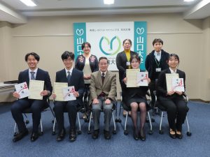 「学生団体活動支援金」は山口大学基金の支援事業の一つであり、前年度(2024年度)に特に優秀な成績を収めた団体に対してその栄誉を称えるとともに、今後のさらなる活躍を期待して活動支援金10万円を贈呈するものです。