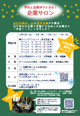 令和7年12月に、山口大学吉田キャンパス「大学会館」において、”学生と企業がツナガル!企業サロン”を開催します。