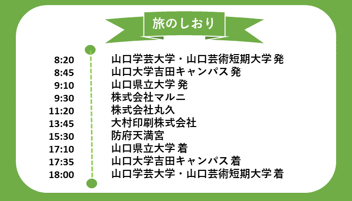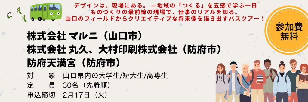 本年度第4回目となる今回は、「デザインは、現場にある。 —地域の「つくる」を五感で学ぶ一日」~ ものづくりの最前線の現場で、仕事のリアルを知る。山口のフィールドからクリエイティブな将来像を描き出すバスツアー!~です。地場で活躍する企業3社(株式会社マルニ、株式会社丸久、大村印刷株式会社)と日本最初の天神さま・防府天満宮を訪問します!