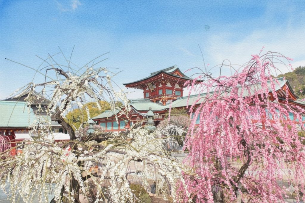 ④防府天満宮 ”令和9年春、菅原道真公 御神忌1125年式年大祭を斎行” 学問の神様・菅原道真公を祀る日本最初の天満宮で、令和9年春には御神忌1125年式年大祭を斎行します。安産祈願や合格祈願など様々な御利益があり、初詣、御神幸祭や花神子社参式など行事も多く、多くの参拝者で賑わいます。2月中旬以降は約16種・1,100本もの紅梅・白梅が美しく咲き誇り、茶室 芳松庵で抹茶体験(800円:お抹茶・お菓子付、16時まで)もできます。