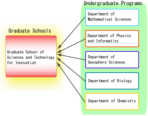 Answer: Many graduates of the Department of Mathematical Sciences, Department of Physics and Informatics and Department of Geosphere Sciences enter the Mathematical Sciences major, Physics and Informatics major and Earth Science major in the Graduate School of Science and Engineering. Graduates of the Department of Biology and Chemistry often continue to the Environmental Science and Engineering major of the Graduate School of Science and Engineering or the Applied Molecular Biology major in the Graduate School of Medicine.