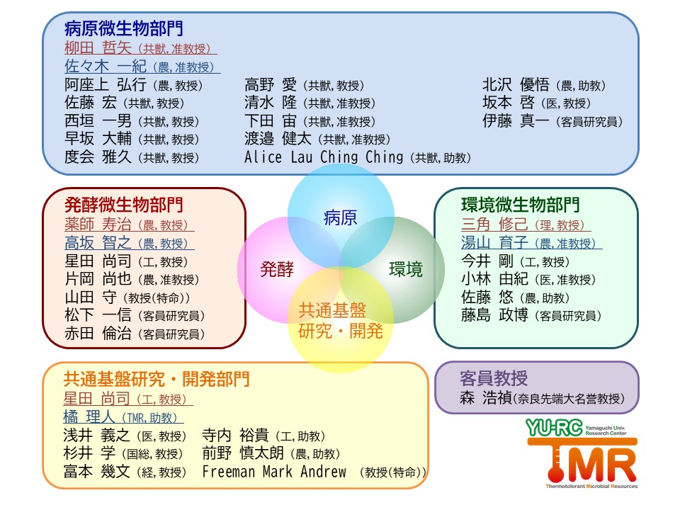 微生物発酵、バイオマス利用、環境浄化、感染症診断・予防などの分野における「中高温機能性微生物」を利用する世界水準の教育研究拠点を構築するため、発酵・病原・環境の3つの微生物学に対する基本的な知識と技術を共有すると同時に、総合的な視野を持った研究分野を構築し、教育研究活動をすすめる。そのために、客員研究者を迎えるとともに、海外や企業の研究機関とのネットワークを強化し、国際的共同研究や産学共同研究をも推進する。そのため、以下のような研究部門にそれぞれ人員(客員研究者も含め)を配置し、活発な教育研究活動を推進する。