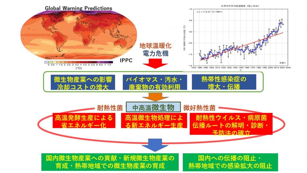 これらの活動をベースとし、地球温暖化に伴う諸問題(エネルギー枯渇・食料危機・感染症対策・環境保全・生態系の維持など)とそれによって引き起こされる人類存続に関わる課題を解決する手段として、「微生物機能の活用」及び「微生物増殖の制御」についての研究を推進するとともに、その活動に必要な幅広い知識と技術を持つ世界レベルの研究能力を有する若手研究者を、広くアジアの人材も含め、育成し輩出することを目的としている。