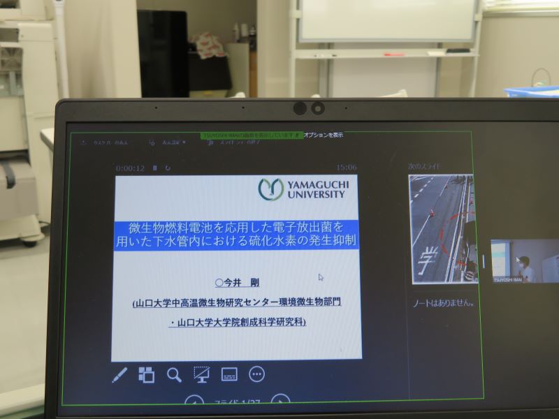 冒頭に部門長の今井から開会挨拶があり,山口大学中高温微生物研究センターの横山和平先生より「CDU肥料施用に伴う分解菌の特異的集積と植物病害の軽減」,同センターの今井より「微生物燃料電池を応用した電子放出菌を用いた下水管内における硫化水素の発生抑制」の2題の一般講演があった。